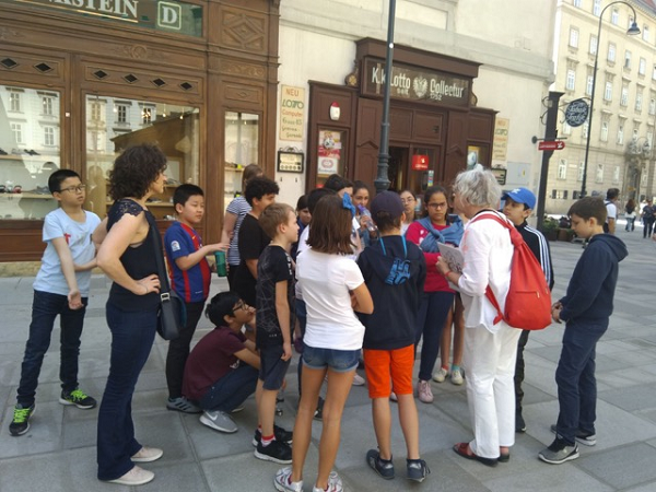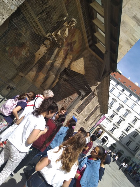 Die Sagenexpertin Ursula Schwarz führte die Schüler und Schülerinnen der 1b durch die Gassen des 1. Bezirks. Sie erzählte, was es mit dem Stock-im-Eisen auf sich hat, wie der Basilisk in der Bäckerstraße besiegt wurde und warum der Nordturm des Stephansdoms unvollendet blieb.