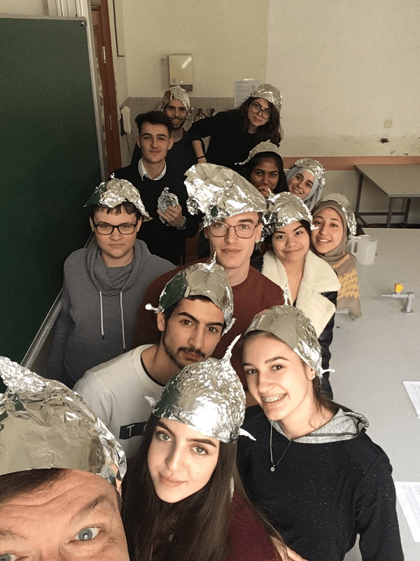 Eine der Stationen beschäftigte sich auch mit der Physik des Aluhuts, der ja als Symbol der Verschwörungstheoretiker gilt und angeblich ja auch vor verschiedensten Strahlungen schützen soll. Dabei bastelten die SchülerInnen natürlich auch einen hübschen Aluhut und stellten fest, dass bei längerer Tragedauer es ziemlich heiß unter dem Hut wird.