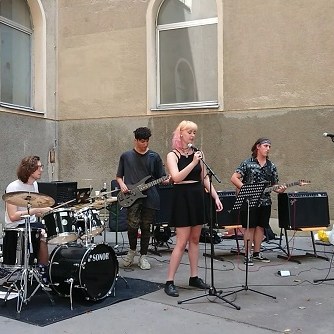 Das Highlight zum Abschluss bildete der Auftritt der Schulband im Hof. Mit Covers von Bands wie Rage Against The Machine und Led Zeppelin und rockigen Eigenkompositionen begeisterten sie bei Traumwetter das Publikum, das lautstark „Zugabe“ forderte.