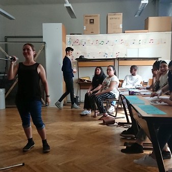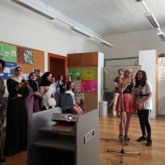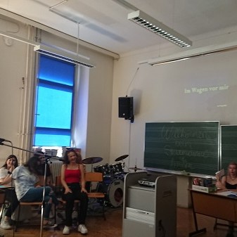 Wer sich mehr für Musik interessiert, konnte am überaus beliebten Karaokewettbewerb der 7M teilnehmen. Schülerinnen dieser Musikklasse saßen in der Jury, verteilten Punkte und kürten drei SiegerInnen. Fast wie bei Starmania! Es gab sogar Urkunden für alle TeilnehmerInnen. (Karaoke war sowohl bei den Jugendlichen als auch bei den Lehrkräften sehr beliebt… Und zum besonderen Vergnügen bewerteten diesmal die SchülerInnen ihre LehrerInnen – und nicht umgekehrt.)