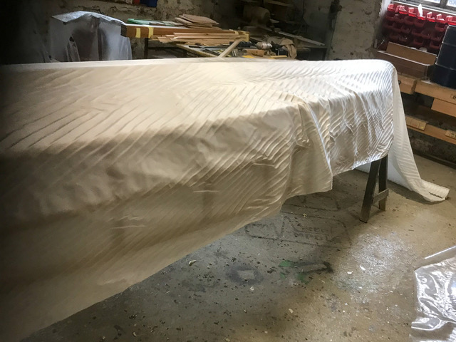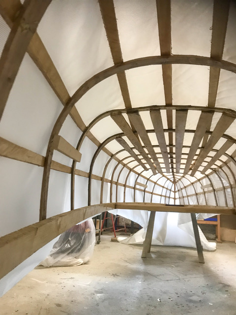 Das Holzgerüst fertigen wir aus astfreien Tannenholz-Leisten für die längs laufenden Senten, und aus gehobelten Haselnuss-Stöcken für die quer liegenden Spanten. Um diese Spanten biegen zu können, bauen wir aus einem Abflussrohr, einem alten Druckkochtopf, einem Gartenschlauch und einer Camping-Herdplatte eine „Dampfbiege-Maschine“, die ihren Zweck hervorragend erfüllt. Senten, Spanten, Kiel und Süllrand werden auf unserer, für den Zusammenbau errichteten Helling montiert und mit einer künstlichen Sehne verbunden. Schließlich wird das Holzgerüst lackiert um es wasserfest zu machen. Als Material für die Bespannung verwenden wir „Ballistic-Nylon“. Das Gewebe wird nach dem Aufziehen auf das Gerüst mit Hilfe eines Bügeleisens geschrumpft,und mit transparentem Polyurethan-Lack wasserfest versiegelt. Aus Holzresten werden zwei Stechpaddel gebaut.