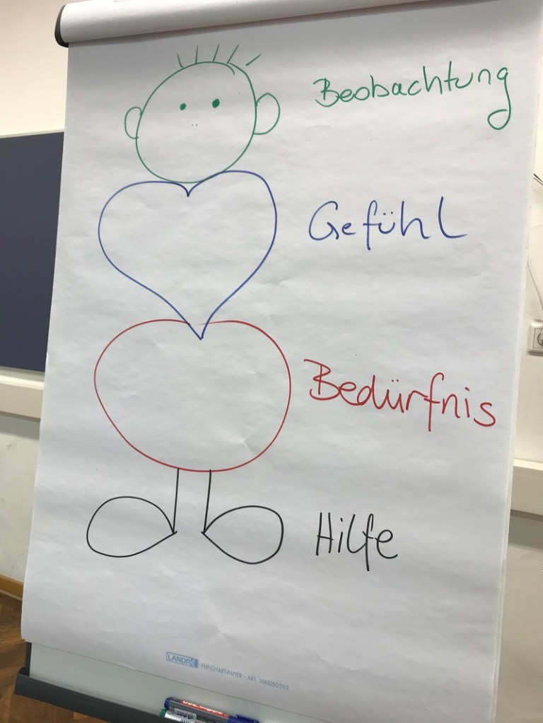 In spielerischer Form wurden Beobachtungen gemacht, dahinterliegende Gefühle analysiert, die zugrunde liegenden Bedürfnisse erforscht und mögliche Hilfestellungen angeboten. Die Aktivitäten umfassten Gesprächsrunden, Partnerarbeiten, die Vorbereitung und Darbietung von Mini-Sketches, das Zuhören von Geschichten, die Analyse unterschiedlicher Sprechstile, verschiedene Auflockerungsspiele und eine gemeinsame Jause.