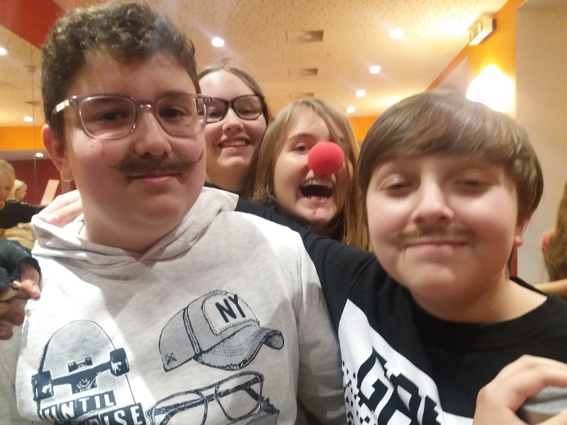 In der Pause gab es für uns Requisiten aus dem Stück zu bestaunen und Maskenelemente wie Bärte, Perücken und Clownsnasen zu probieren. Und so erfuhren wir gleich einige Tricks, mit denen die Profis auf der Bühne arbeiten.