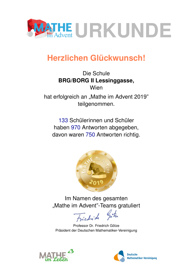 Im vergangenen Jahr hat sich die Lessinggasse das erste Mal im größeren Stil am Projekt „Mathematik im Advent“ beteiligt. Im Rahmen dieses Projekts wurde an jedem Tag im Advent ein Rätsel veröffentlicht. Die SchülerInnen konnten dieses Rätsel entweder ausgedruckt im Schulhaus finden oder online einsehen und die Antwort abgeben. Es nahmen 5 Klassen – alle ersten Klassen, 2B, 3A, 3B und die 3U – an diesem Wettbewerb teil.