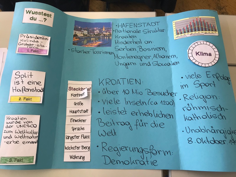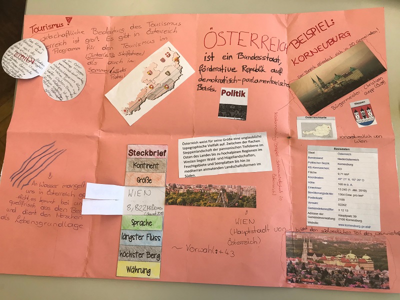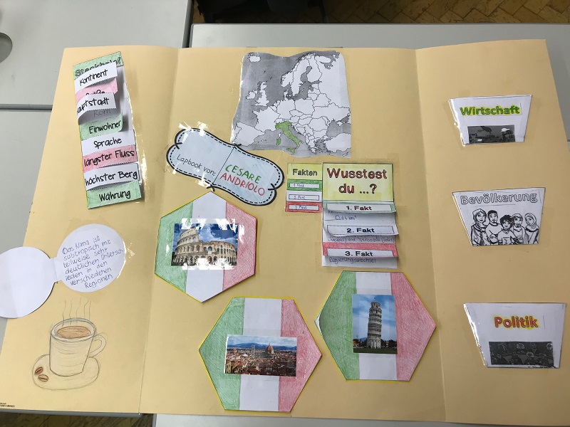 Im Geographie- und Wirtschaftskundeunterricht erstellten die SchülerInnen der 4B Lapbooks über einen von ihnen selbst gewählten europäischen Staat. Durch die Herstellung eines Lapbooks, Klappenbuch, das seinen Ursprung im englischsprachigen Raum hat, eignen sich die SchülerInnen bastelnd, schreibend und zeichnend selbstständig, mit Unterstützung der Lehrkraft, Wissen zu einem bestimmten Thema an. Die fertigen Lapbooks wurden dann den KlassenkammeradInnen im Unterricht präsentiert.