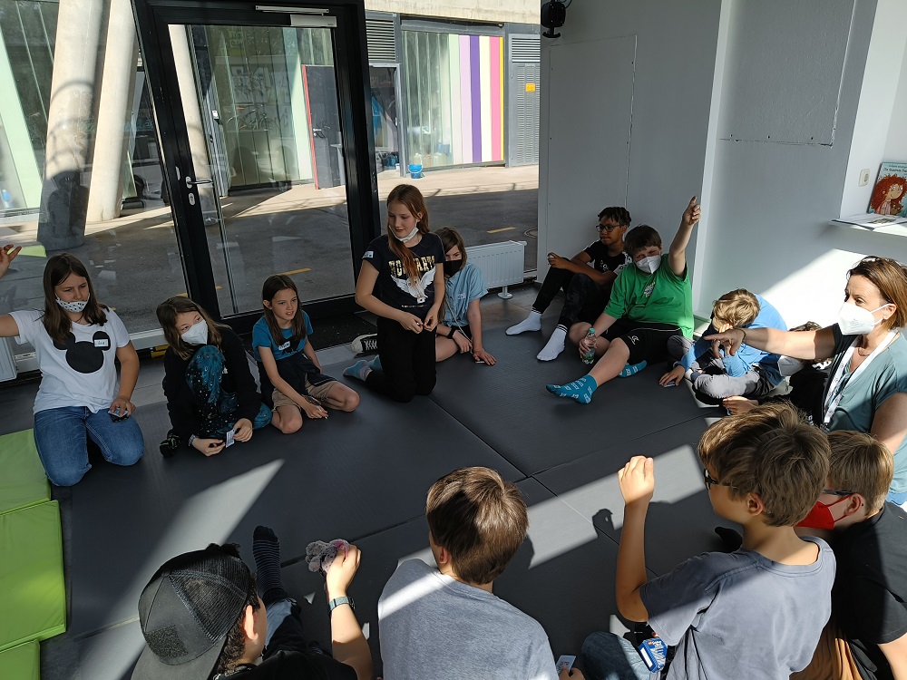 Philosophiert haben wir auch, indem wir bei dem Buch „die feuerrote Friederike“ einen Teil gelesen und dann darüber gesprochen haben, ob wir es gut fänden, wenn es eine Welt ohne Geld geben würde. Bei der vorletzten Station haben wir noch Nachrichten an Aliens gezeichnet und geschrieben, die wir dann an eine Pinnwand gepinnt haben. Damit haben wir ihnen unsere Ideen von Geld mitgeteilt.