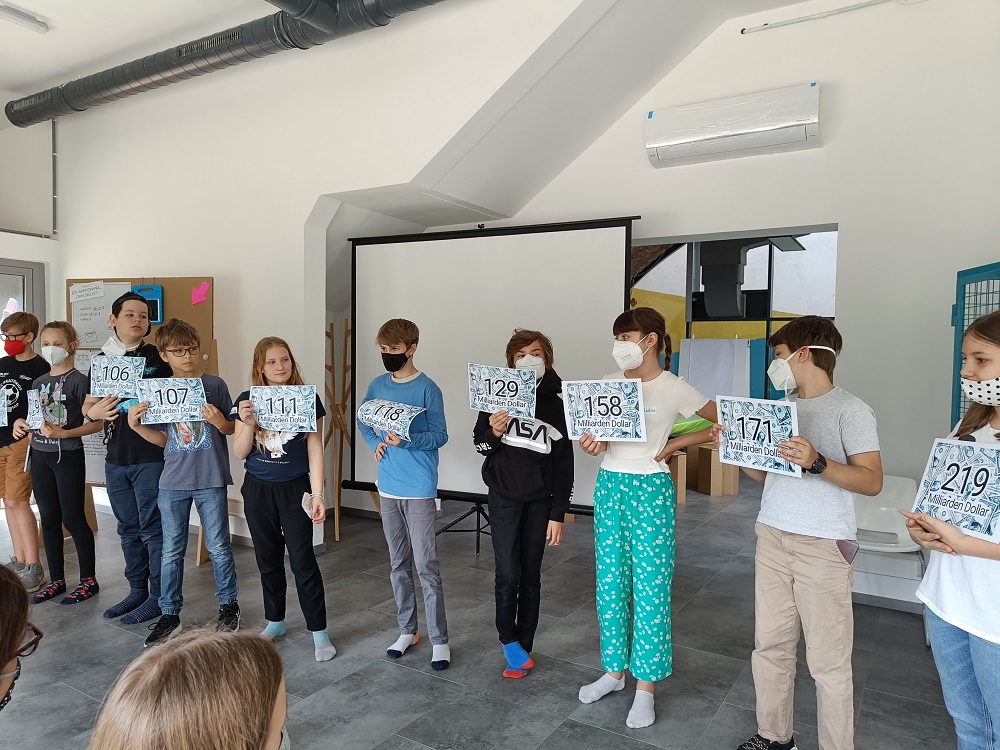 Anschließend durften wir den Workshop testen und gingen ins DOCK am Donaukanal. Es gab verschiedene Stationen und wir haben viel dabei gelernt. Zum Beispiel, dass die 10 reichsten Menschen alle Männer sind. Sie haben zusammen so viel Geld, dass jeder von ihnen 412 Jahre lang jeden Tag eine Million Dollar ausgeben könnte.