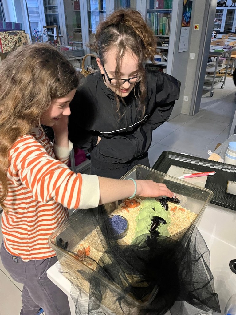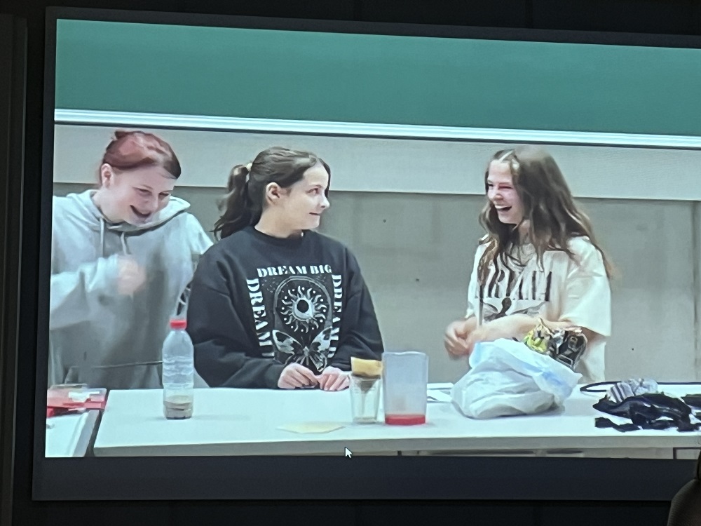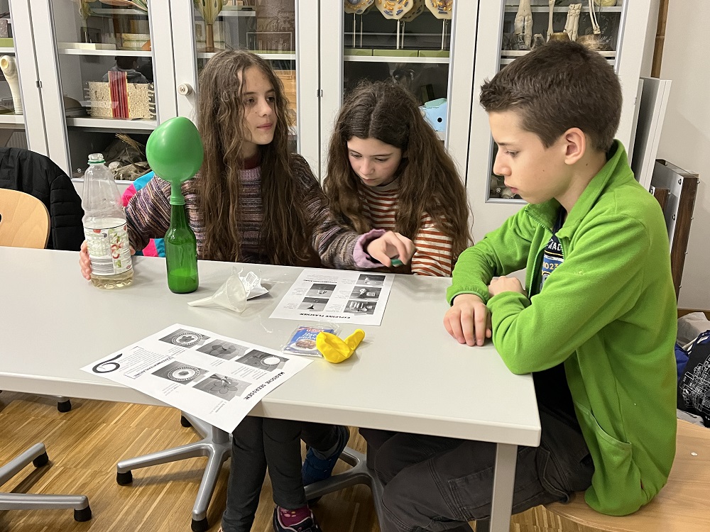 Ausgangslage war ein Diebstahl des hinterlistigen Myxus myxotus, der in der biologischen Sammlung Artefakte entwendet hatte. Im Laufe einer Schnitzeljagd, bei der verschiedene Stationen wie Morsecode auflösen, Tiergeräusche definieren, Mehlkäfer beobachten, Geheimschriften entziffern und Ähnliches absolviert werden mussten, konnten die jungen Forscher*innen ihre Kombinationsfähigkeiten unter Beweis stellen. Im Anschluss daran gab es eine Stärkung in Form eines gemeinsamen Abendessens, bei dem sich alle mit wunderbaren mitgebrachten Speisen stärken konnten. Als zweiten Block bereiteten die Schüler*innen Experimente vor, die sie dann in einer Show vor der Klasse vorführten.
