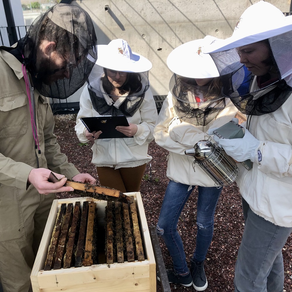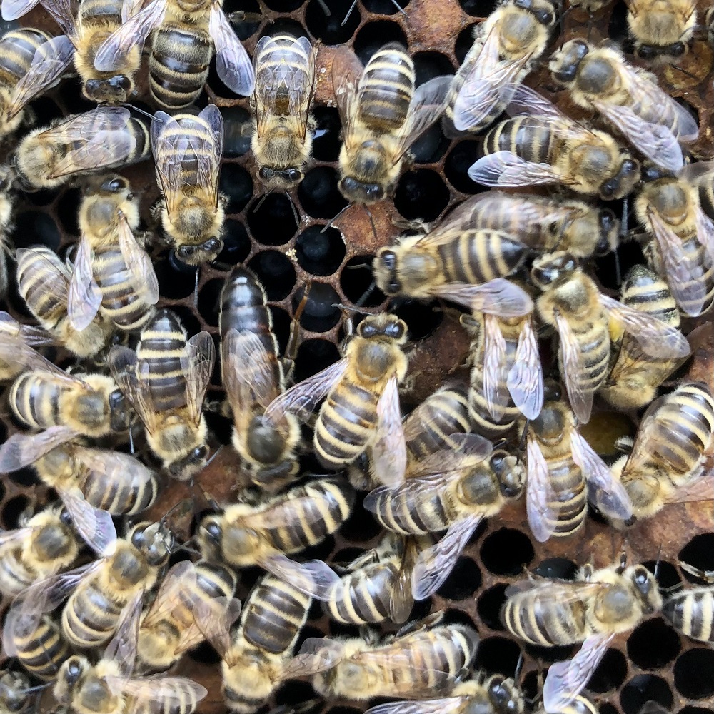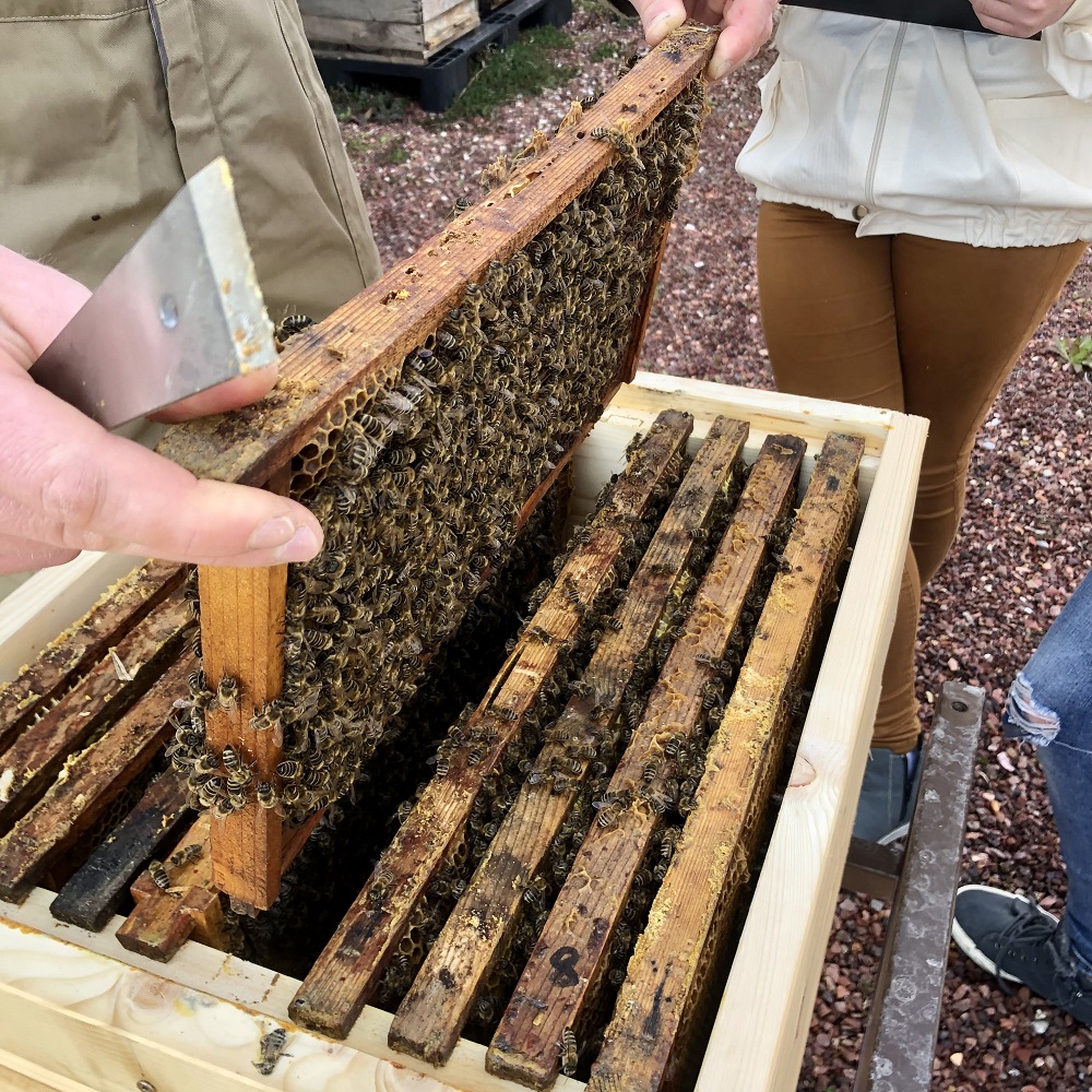 Endlich war es warm genug, um die mit der Förderung neu gekauften Anzüge bei der Völkerdurchsicht zu verwenden. Auch ungezeichnet ist die Königin den Schüler*innen sofort aufgefallen. Jetzt hoffen wir, dass der lang ersehnte Regen der letzten Wochen der Natur ein wenig auf die Sprünge hilft und die Völker stärker werden.