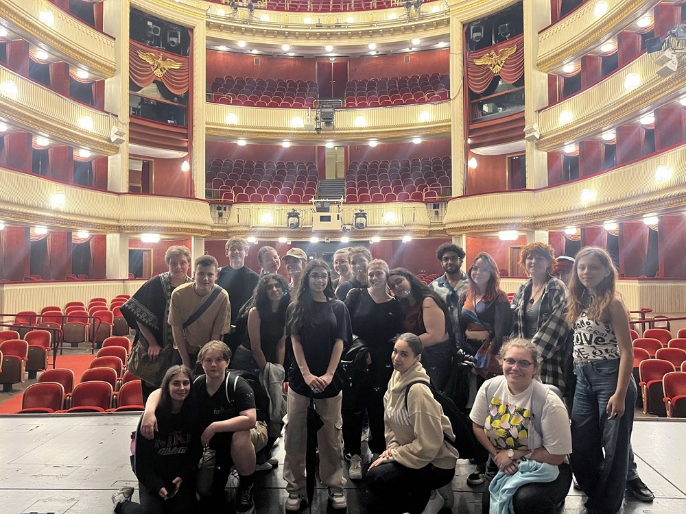 Den Nachmittag rundete eine Führung durch das Burgtheater ab, bei der die Schülerinnen und Schüler Einblicke in die interessante Geschichte und Architektur des Hauses erhielten. Wusstet ihr, dass in einer Loge der „Burg“ ein Mord verübt wurde? Dass sich Schnürboden und Beleuchtungsbrücken in einer Höhe von 28m befinden? Als krönender Abschluss durften wir uns wie Schauspielerinnen des Hauses fühlen und von der größten deutschsprachigen Bühne des Sprechtheaters in das Publikum blicken.