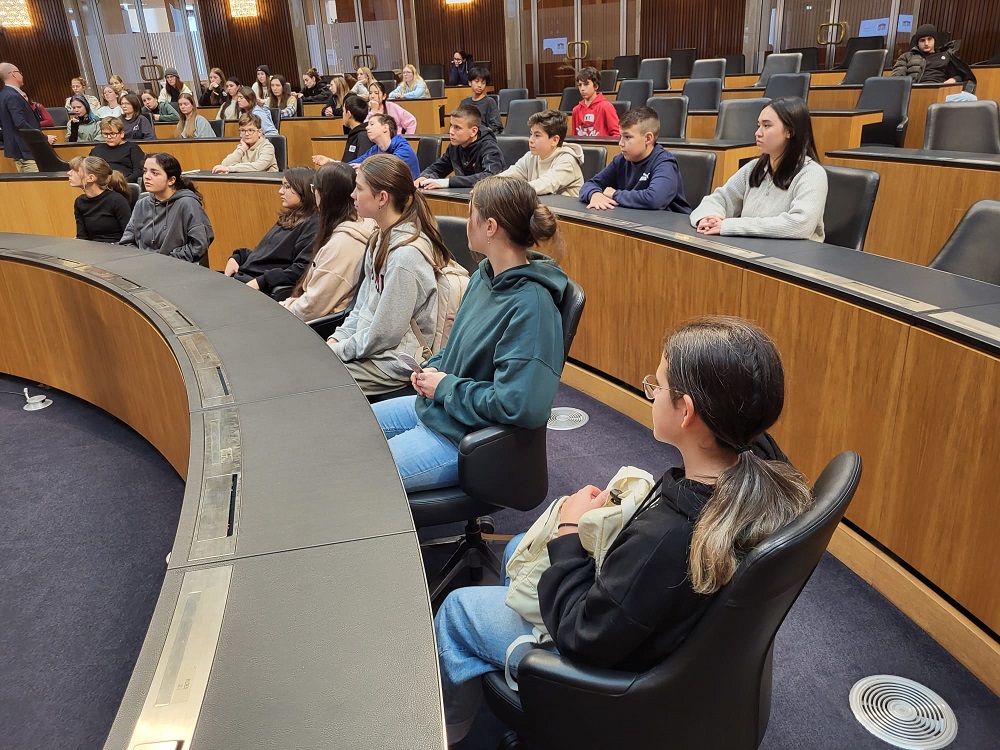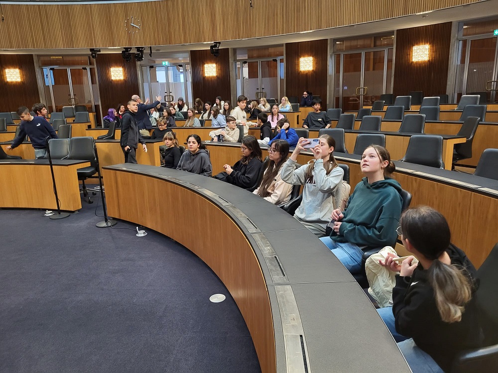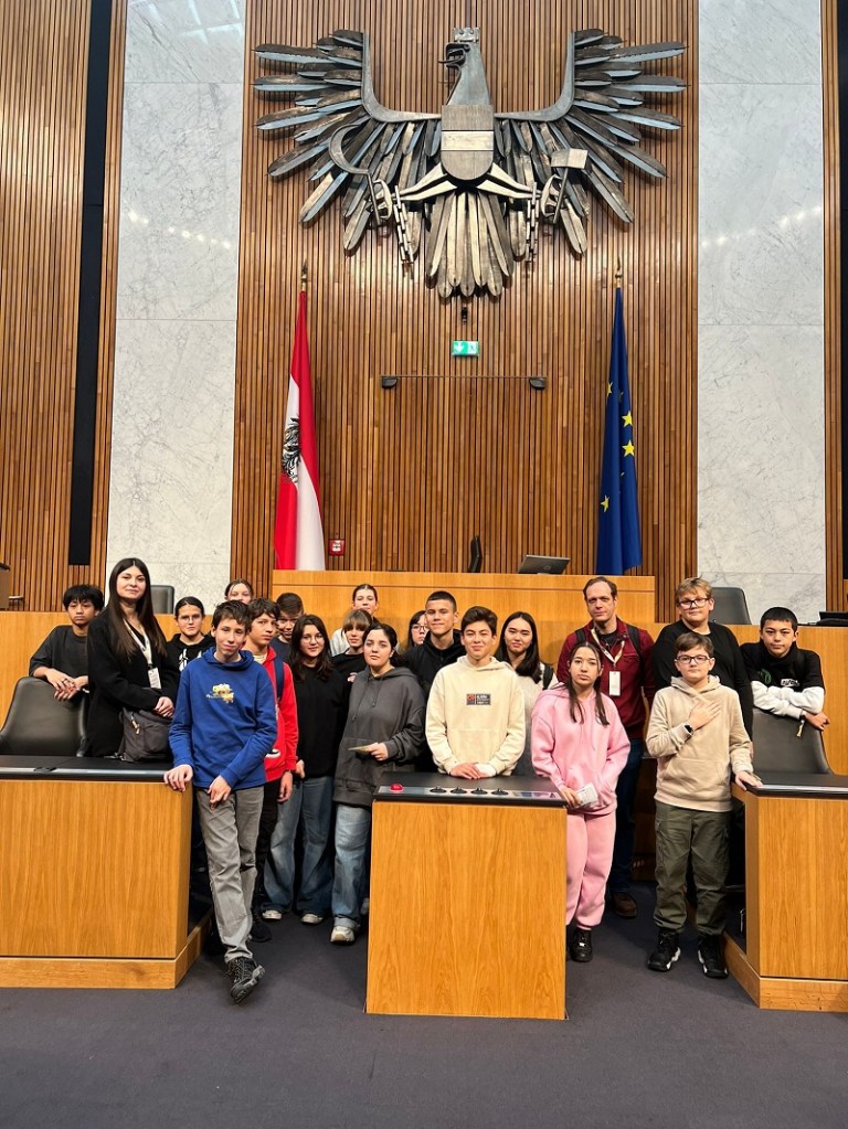 Die 4B bewegt sich im Rahmen des Geschichteunterrichts auf den Spuren der Demokratie, wir haben das Parlament besucht. Dabei haben wir die Säulenhalle, den historischen Sitzungssaal und den heutigen Plenarsaal gesehen.
