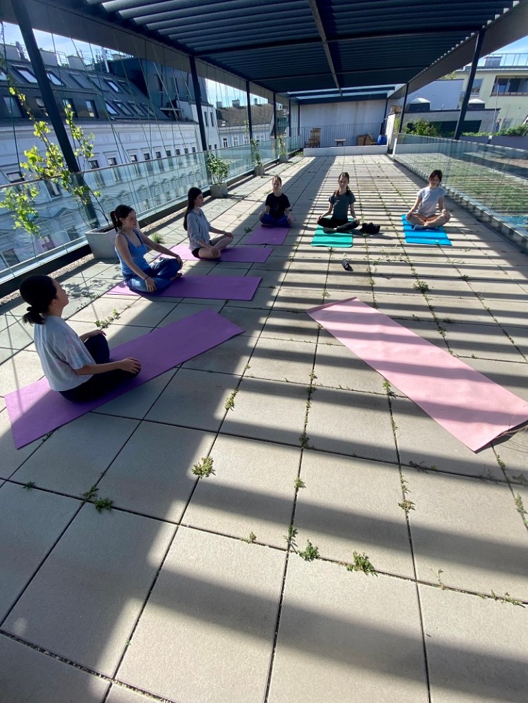 UÜ Yoga 23/24 19. April 2024 / romangraf Die Schüler*innen der unverbindlichen Übung Yoga genießen die ersten Sonnenstrahlen am Dach unserer Schule 🙂