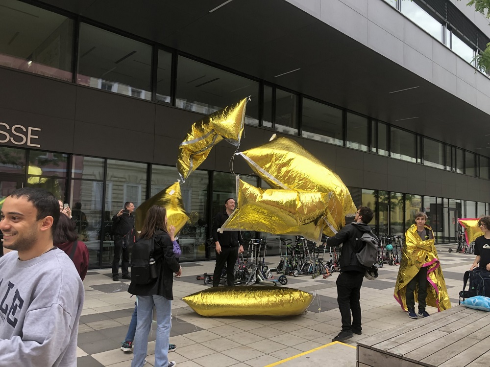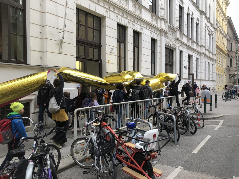Das erste Highlight des Semesterprojekts war der gemeinsame Walking School Bus. Studierende und Schüler*innen der 4D organisierten „Haltestellen“ an denen Kinder der Volksschule Vereinsgasse in der Früh zu Fuß „zusteigen“ konnten. Gemeinsam spazierten sie dann mit goldenen Ballons zur Volksschule und lieferten dort die sichtlich erfreuten VolksschülerInnen sicher ab.