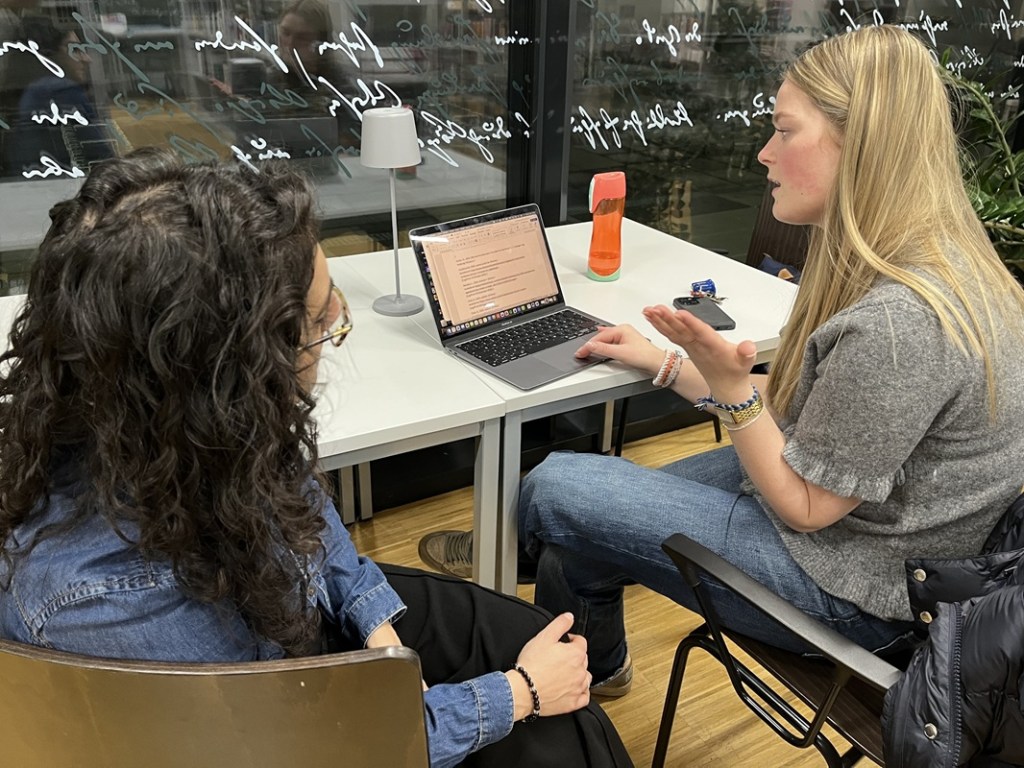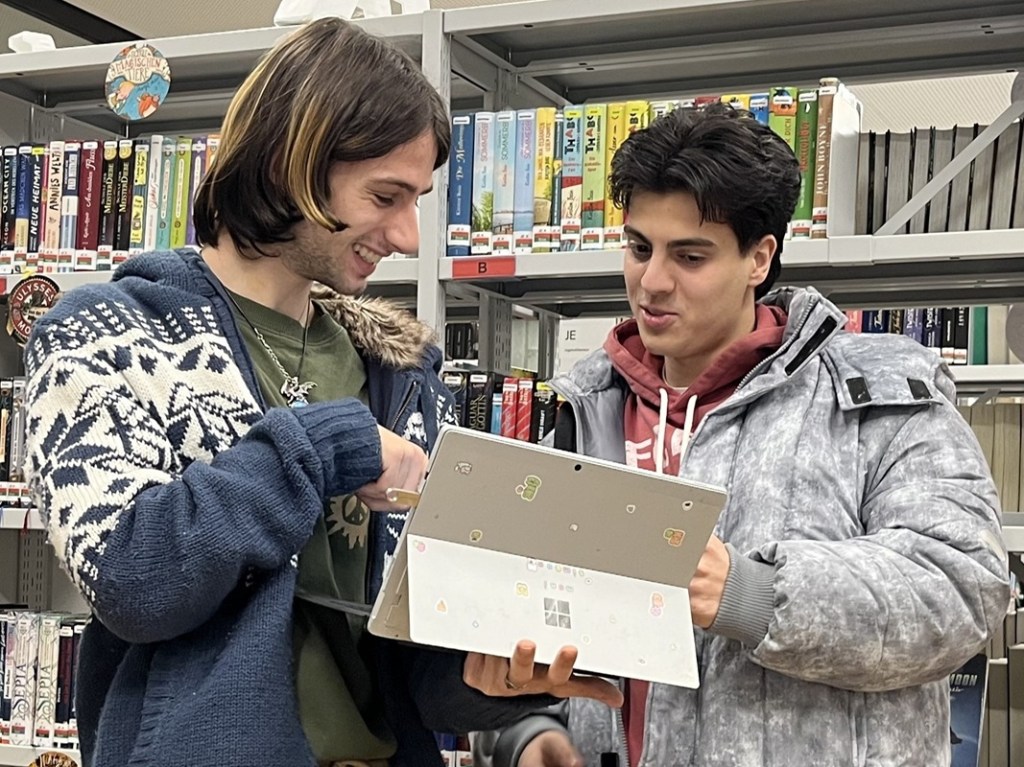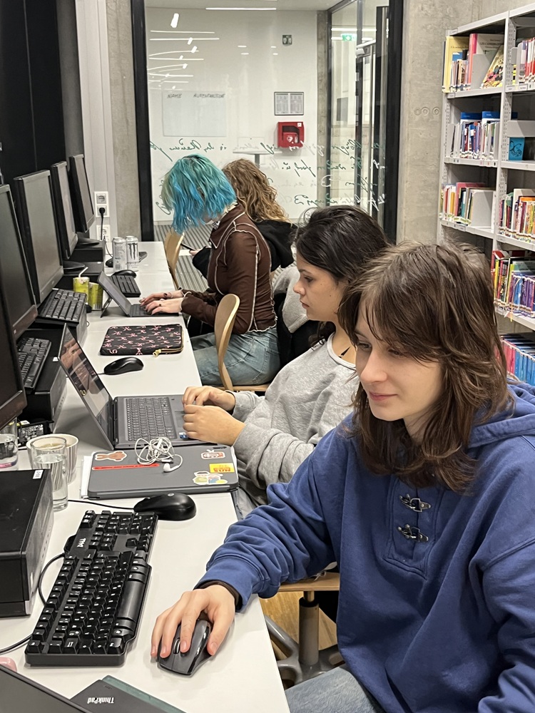 Drei Wochen vor dem Abgabetermin der ABA-Arbeiten trafen sich Schüler*innen der 8. Klassen am Abend in der Schulbibliothek, um gemeinsam zu schreiben, zu diskutieren und an ihren Texten zu feilen. Prof. Muroni und Prof. Dirlinger leisteten Unterstützung beim Layout und kniffligen Zitierproblemen.