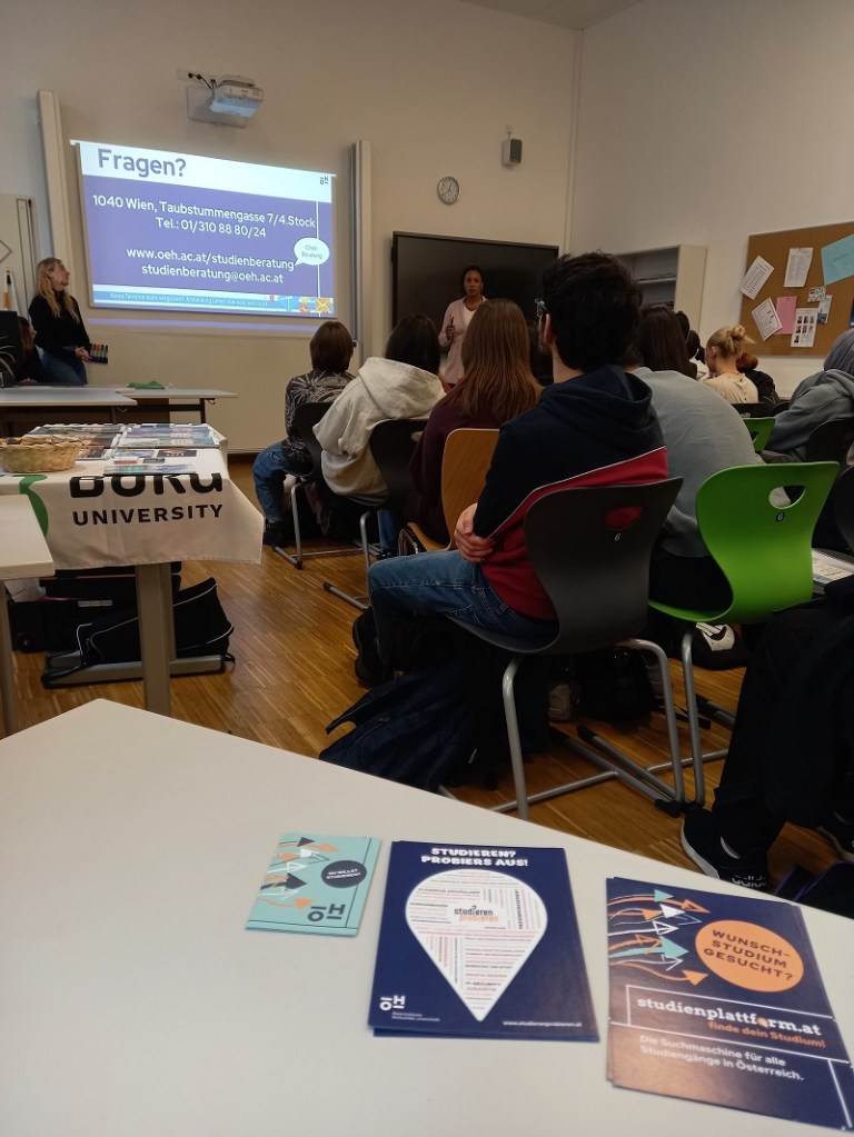 Wie schon im vergangenen Jahr stellte die ÖH die vielfältigen Studienmöglichkeiten vor und informierte über wichtige Schritte rund um Einschreibung und Studienablauf. Darüber hinaus präsentierten die WU, die BOKU sowie die Hochschule Campus Wien ihre jeweiligen Studienangebote und inhaltlichen Schwerpunkte. Zum Abschluss nutzten die Schüler*innen die Gelegenheit, sich an den einzelnen Ständen persönlich auszutauschen, offene Fragen zu klären und zusätzliches Informationsmaterial mitzunehmen. Angesichts der großen Vielfalt an Ausbildungswegen ist es oft eine Herausforderung, die passende Entscheidung zu treffen – umso mehr hoffen wir, dass diese Veranstaltung den Jugendlichen dabei geholfen hat, ihren weiteren Bildungsweg klarer zu sehen.