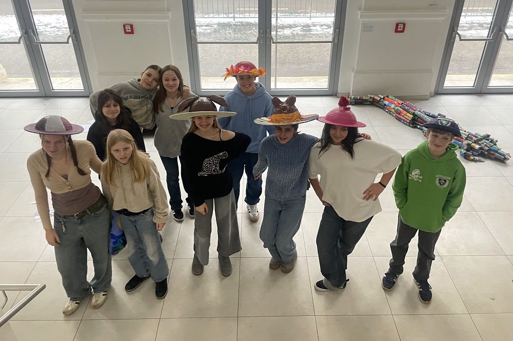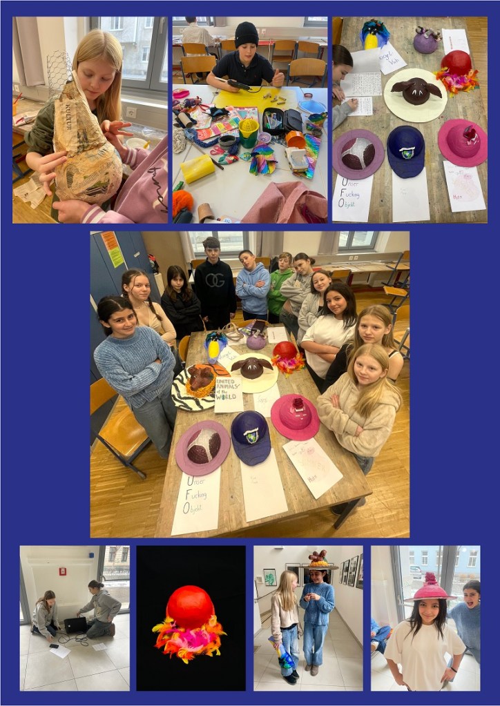 Mit diesen Fragen setzte sich die 3B dieses Semester nicht nur theoretisch auseinander. Die Schüler*innen beschäftigten sich mit Formenbau und experimentierten mit verschiedenen (u.a. selbstmitgebrachten Recycle-) Materialien sowie Farben. Entstanden sind unverwechselbare Kopfbedeckungen, die am Ende fotografisch festgehalten und in einer selbst organisierten Modenschau präsentiert wurden.