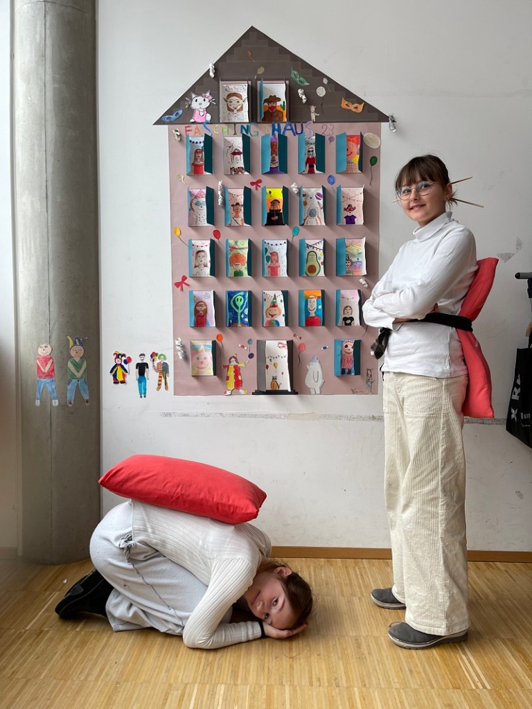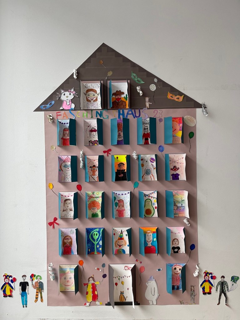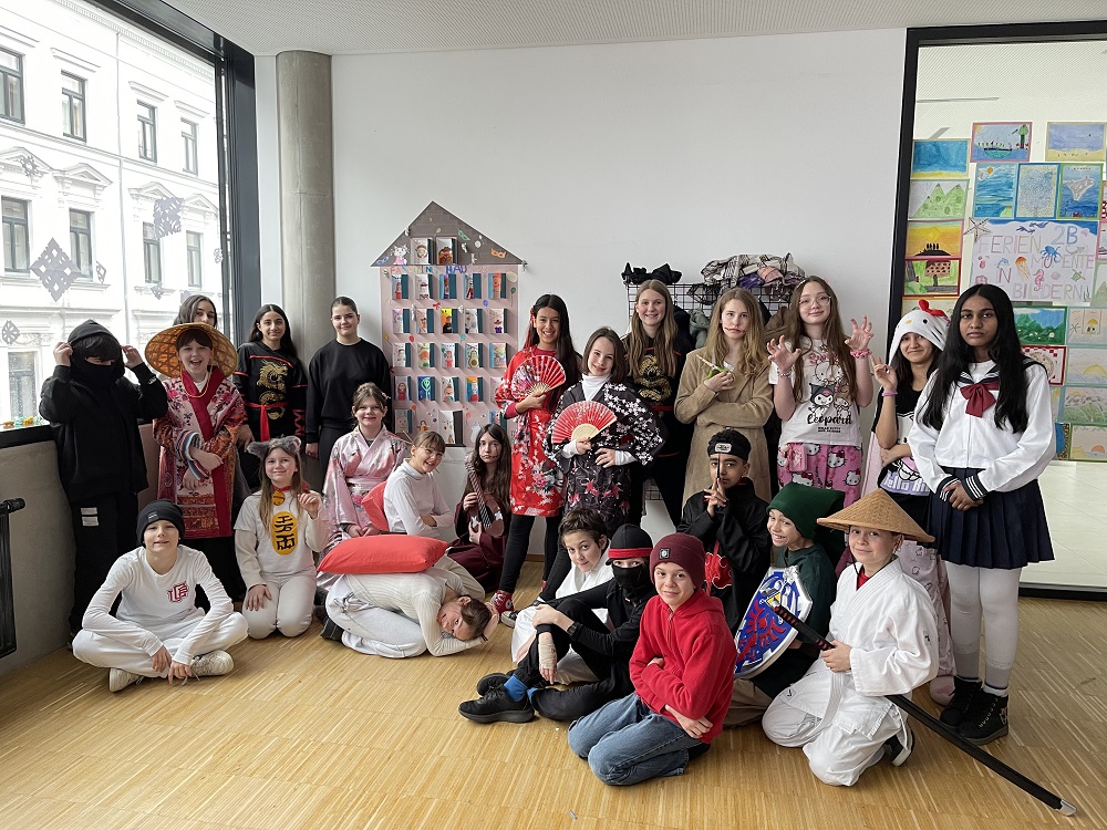 Auch in diesem Jahr feierte die Klasse 2B den Schulfasching. Im Kunstunterricht gestalteten die Schülerinnen lustige, bunte Zeichnungen für unser Klassenhaus, das sich vom Weihnachtshaus in ein Faschingshaus verwandelte. In diesem Haus hat jeder Schülerin ein eigenes „Zimmer“ und schaut im Faschingskostüm aus dem Fenster, um dem bunten Treiben in der Klasse beizuwohnen. Am Faschingsdienstag diente das Faschingsklassenhaus als Kulisse für die originellen Verkleidungen der Schülerinnen, die in diesem Jahr unter dem Motto „Japan“ standen: Es gab Ninjas, Samurai, Kimonos, Fächer und Reishüte zu sehen.