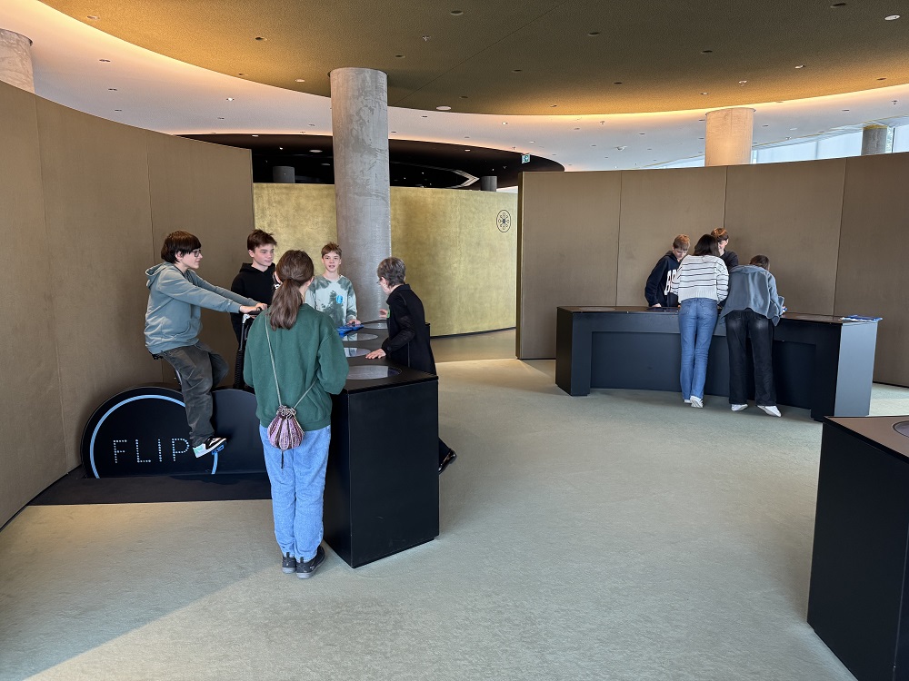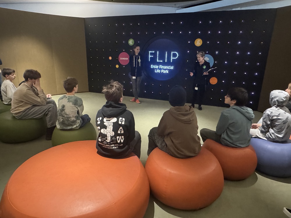 Die Klasse 3B besuchte die FLIP-Tour, eine interaktive Erfahrung, um den nachhaltigen und sparsamen Umgang mit Geld und Ressourcen des Planets zu erlernen.