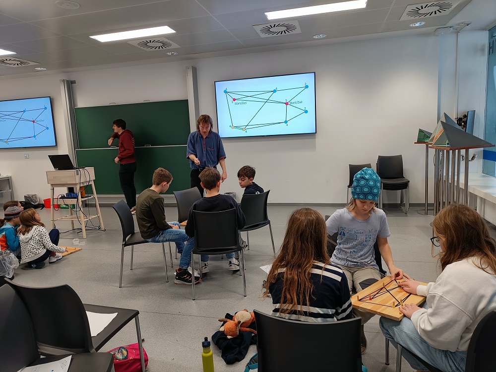 Die 1A hat ein Programm der TU Wien für Schulklassen besucht: „Graphen – Ein Weg um Wege zu finden“. Die Schüler*innen lernten Graphen kennen, die zwar einfach, aber dadurch auch sehr vielseitig anwendbar und faszinierend sind. Ausgehend vom Königsberger Brückenproblem und „dem Haus des Nikolaus“ wurde erforscht, welche Wege es durch Graphen gibt und wie man den kürzesten findet.