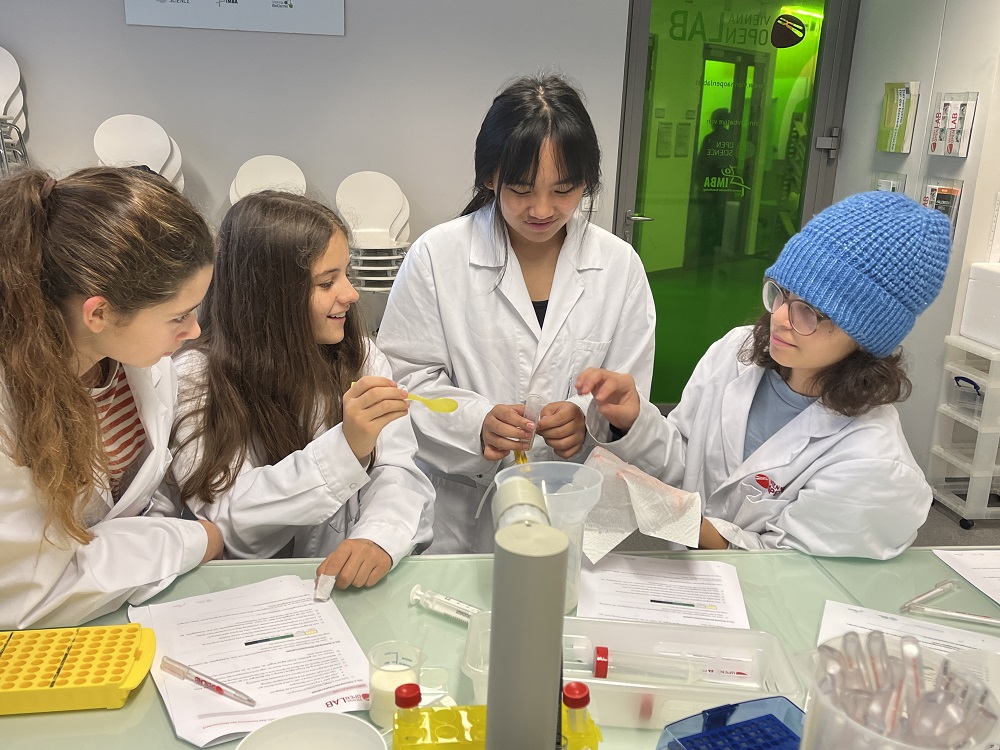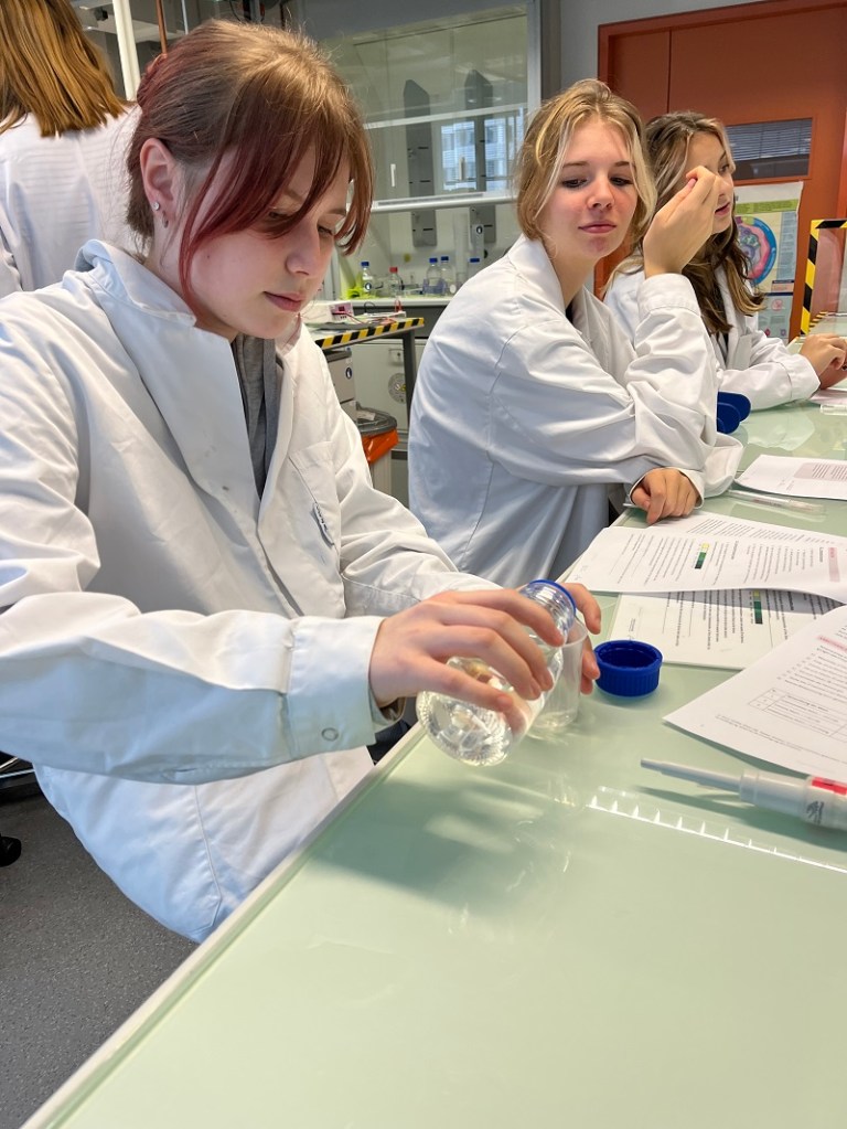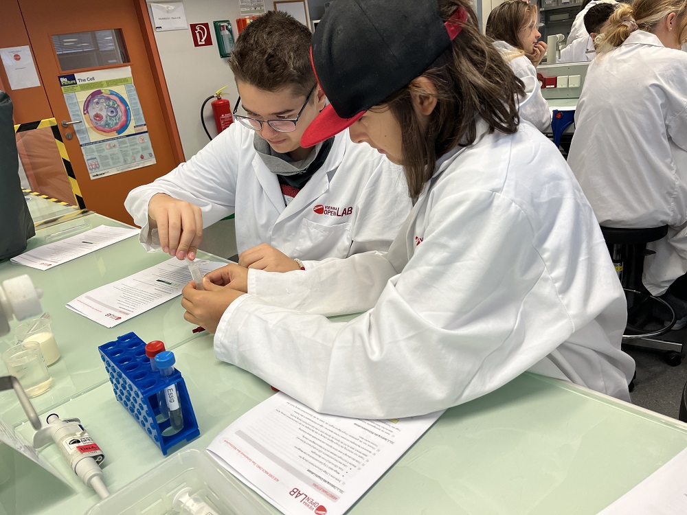 Nach einer Einführung zum Thema ‚Milchzucker‘ wurden spannende Experimente durchgeführt: Die Schüler*innen spalteten Laktose mit Laktase und erzeugten so laktosefreie Milch. Beim Experiment der Homogenisierung konnten sie herausfinden, dass sich bei Rohmilch mehr Fett absetzt als bei homogenisierter Milch. Zum Abschluss wurde der Geschmack von normaler Milch und laktosefreier Milch verglichen. Die Schüler*innen fanden heraus, dass laktosefreie Milch im Vergleich zu Vollmilch bedeutend süßer schmeckt, da die Laktose hier bereits gespalten wurde.