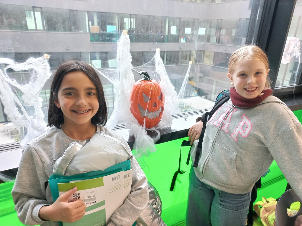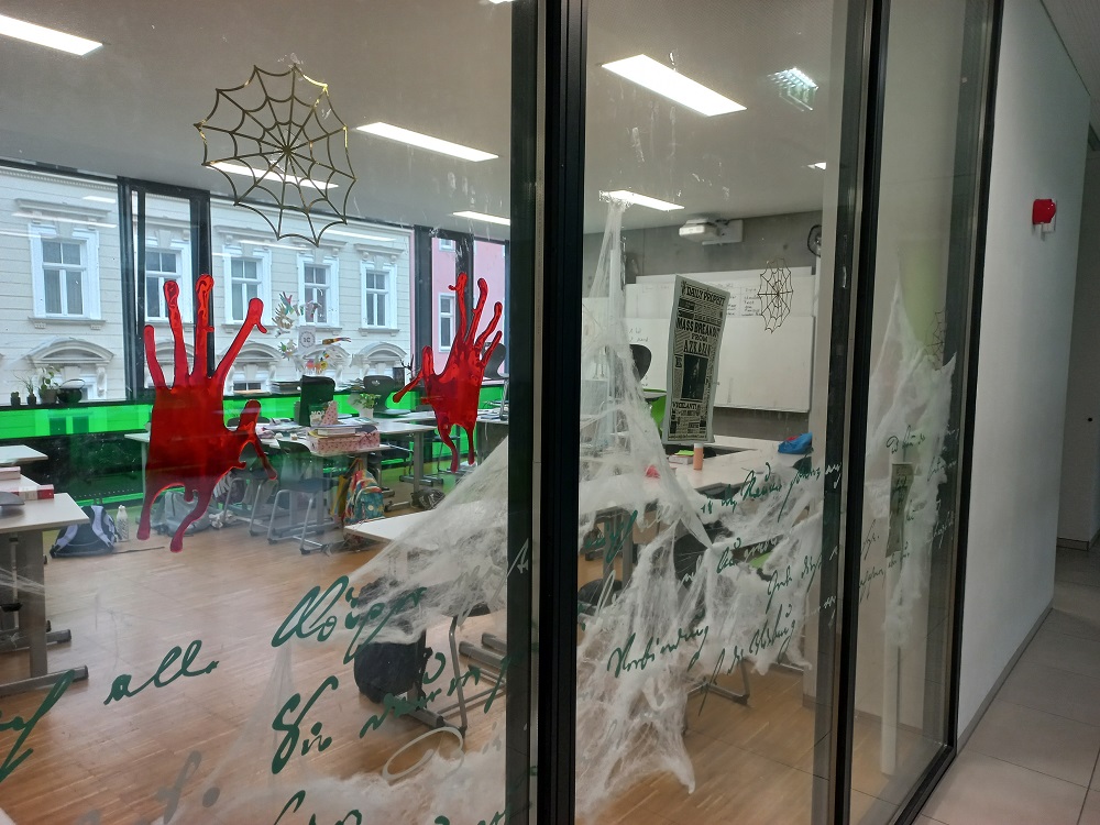 Während vor der Schule das bunte Laub zu Boden sinkt, füllen sich die Gänge der Unterstufenklassen mit gruseligen Gesellen, Geistern und Skeletten um Halloween und Kürbiszeit 🎃 zu zelebrieren.