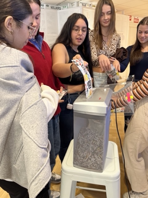 Die Klasse hatte sichtlich Spaß und wurde im Rahmen des Vermittlungsprogammes zu einem reflektierten Umgang mit sensiblen Daten angeregt – am Ende durften diese persönlichen (Schüler:innen)Daten selbst geschreddert werden!