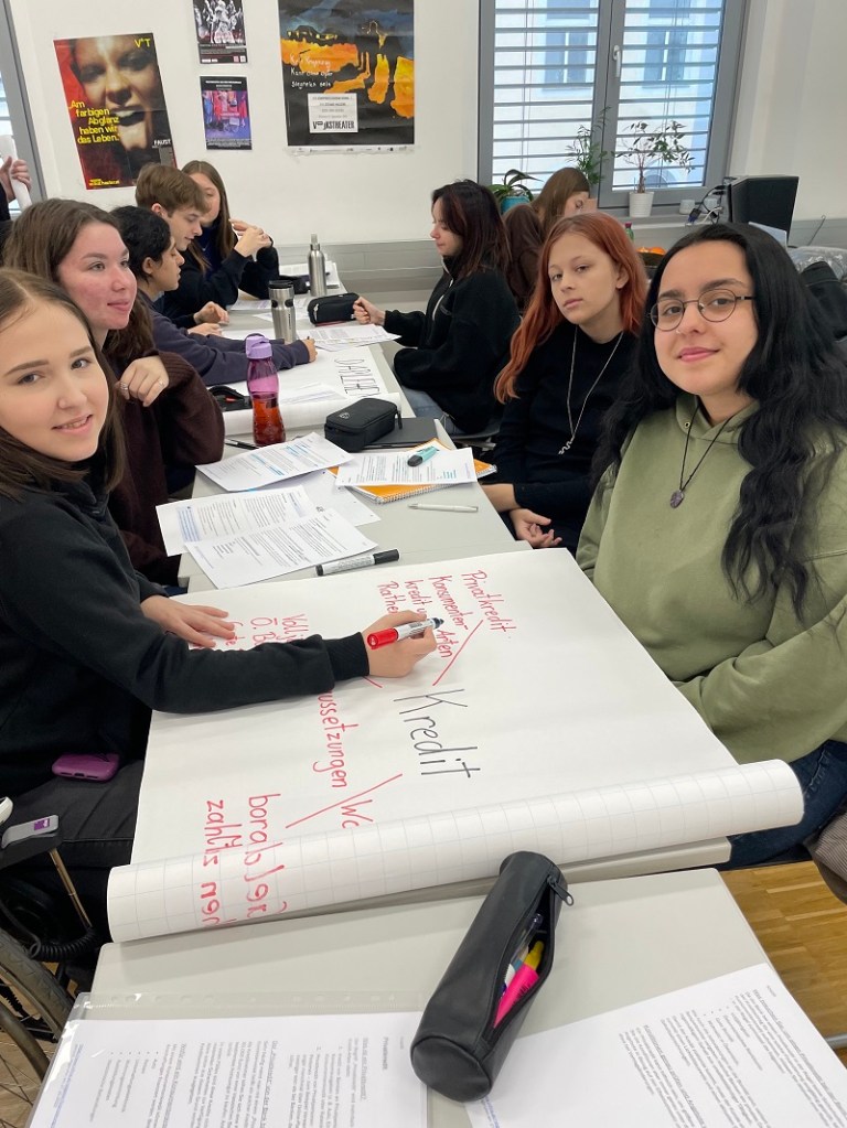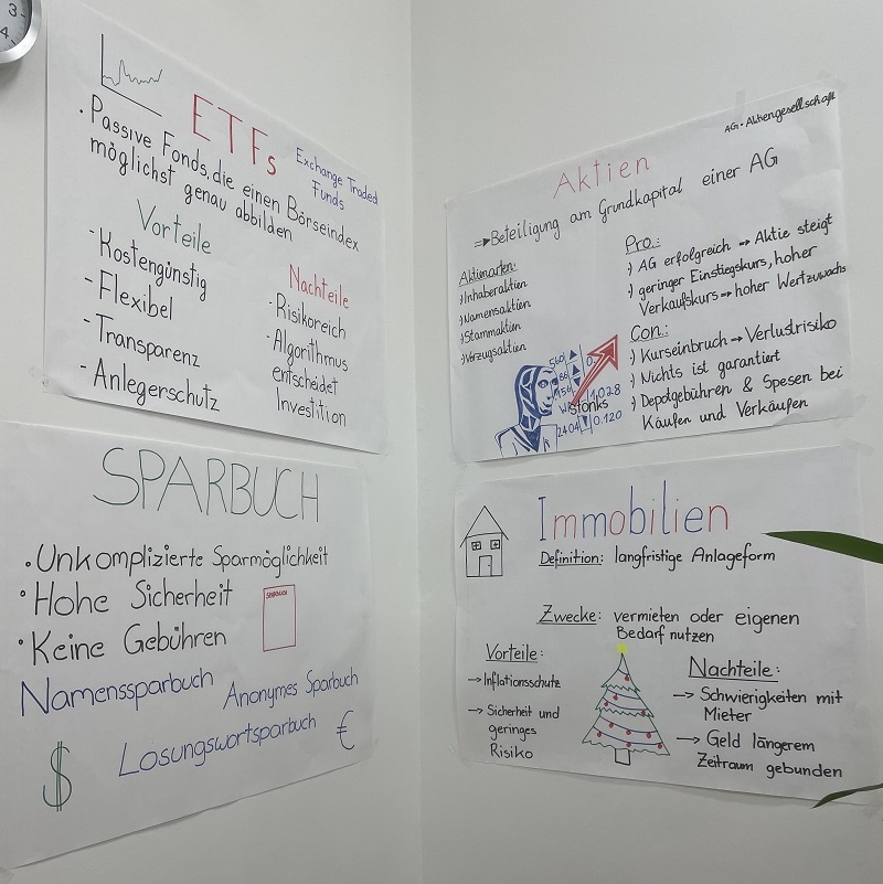 Bei einem jeweils zweistündigen Workshop zum Thema Finanzierung, beziehungsweise Investitionen erfuhren die Schüler*innen der 7. Klasse den Unterschied zwischen den Finanzierungsformen Kredit, Leasing, Darlehen und Hypothekarkredit, sowie die Vor- und Nachteile in ETFs, Aktien, ein Sparbuch oder Immobilien zu investieren.
