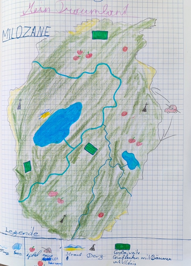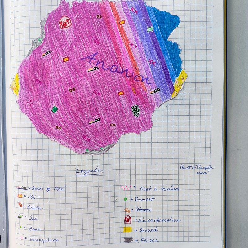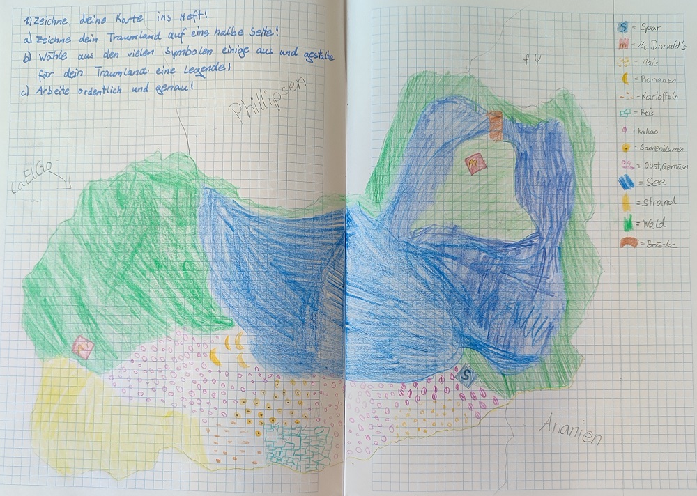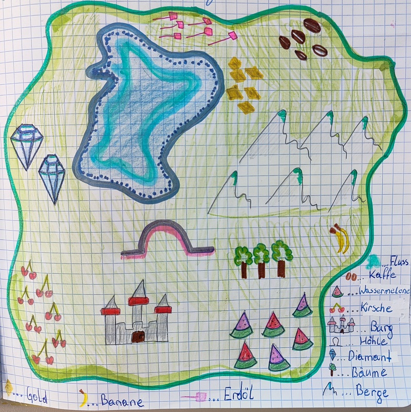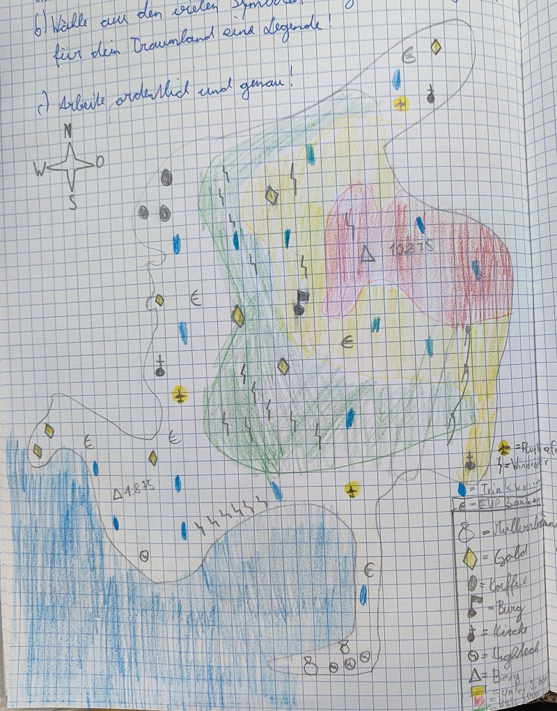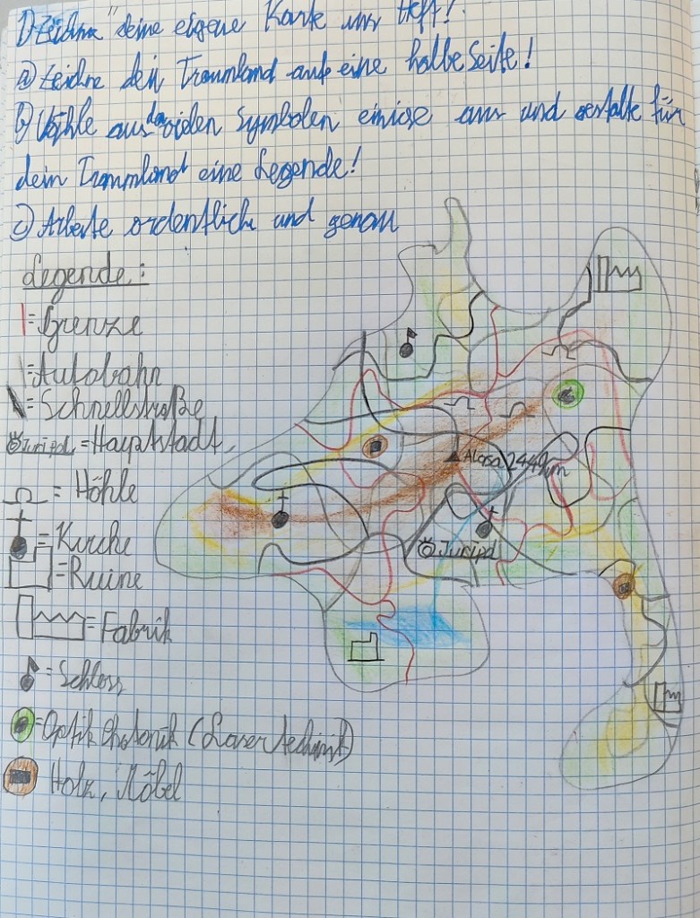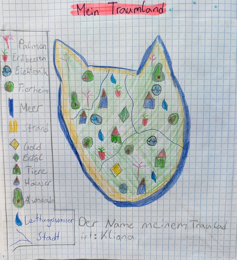 Nachdem sich die Schüler*innen der 1B mit den wesentlichen Aspekten von Kartendarstellungen im Geographieunterricht beschäftigt hatten, gab es die Aufgabe, eine eigene ‚Traumland‘-Karte zu erstellen und die dargestellten Elemente in einer Legende festzuhalten. Dabei sind einige tolle, kreative Bilder entstanden.