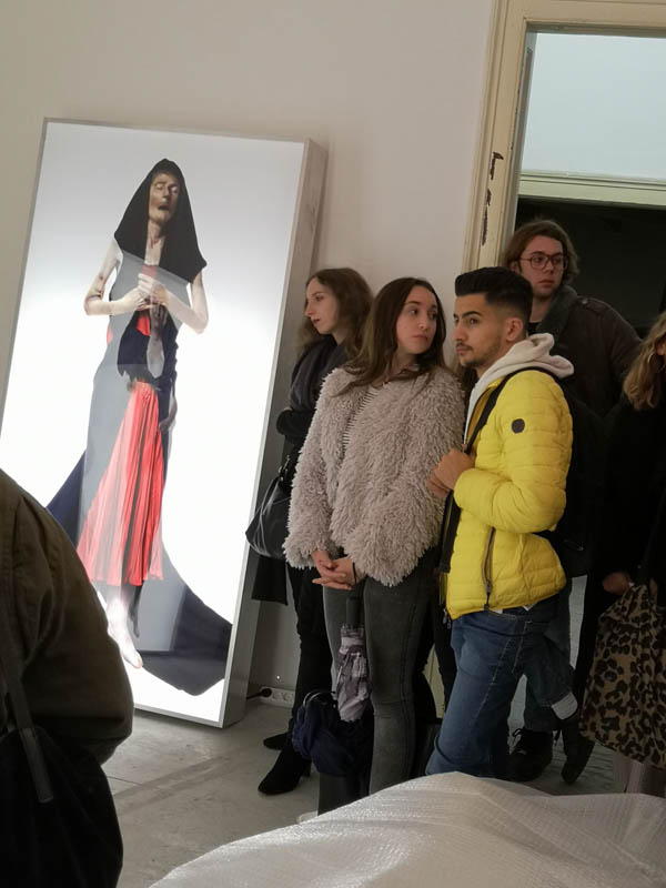 Am Nachmittag des 6.11. besuchten SchülerInnen der Klasse 8CBT und des Wahlpflichtfachs PuP, im Rahmen eines Kunstprojekts gemeinsam das Depot der Knoll Galerie in der Esterhazygasse, wo Herr Hans Knoll und sein Assistent eigens für diesen Anlass drei Lightboxes aus der Serie „Défilé“ des russischen Künstlerkollektivs AES+F aufgebaut hatten.