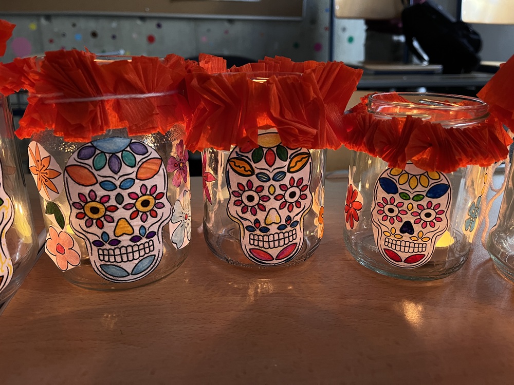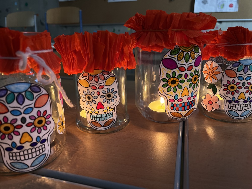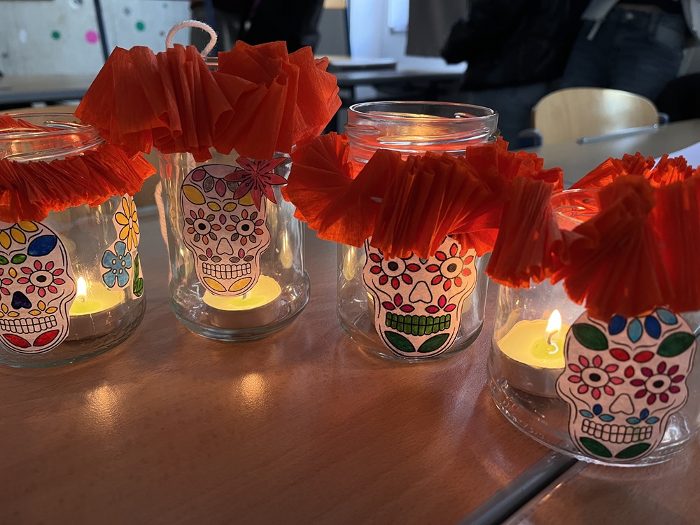Das Wahlpflichtfach Spanisch hat sich in der letzten Oktoberstunde mit den Feierlichkeiten und Bräuchen zum mexikanischen Totengedenktag auseinandergesetzt. Im Anschluss daran wurde eine Interpretation den Hausaltares (el altar de la casa) mit Totenkopf (calavera), Blumen (flores) und Kerzen (velas) gebastelt.