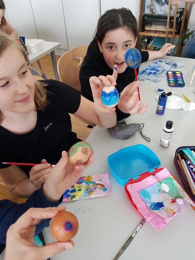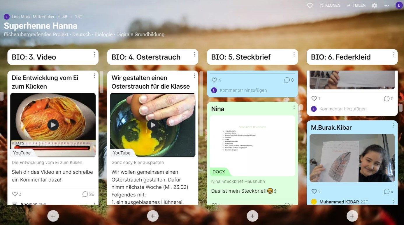 Auch unsere Biologie-Professorin beteiligte sich an dem Projekt und stellte uns Biologie-Aufgaben auf das „Padlet“ – Wir lernten viel Wissenswertes über das Huhn, zeichneten eine Fantasiefeder und bemalten Eier. Das könnten Sie auch einmal versuchen!