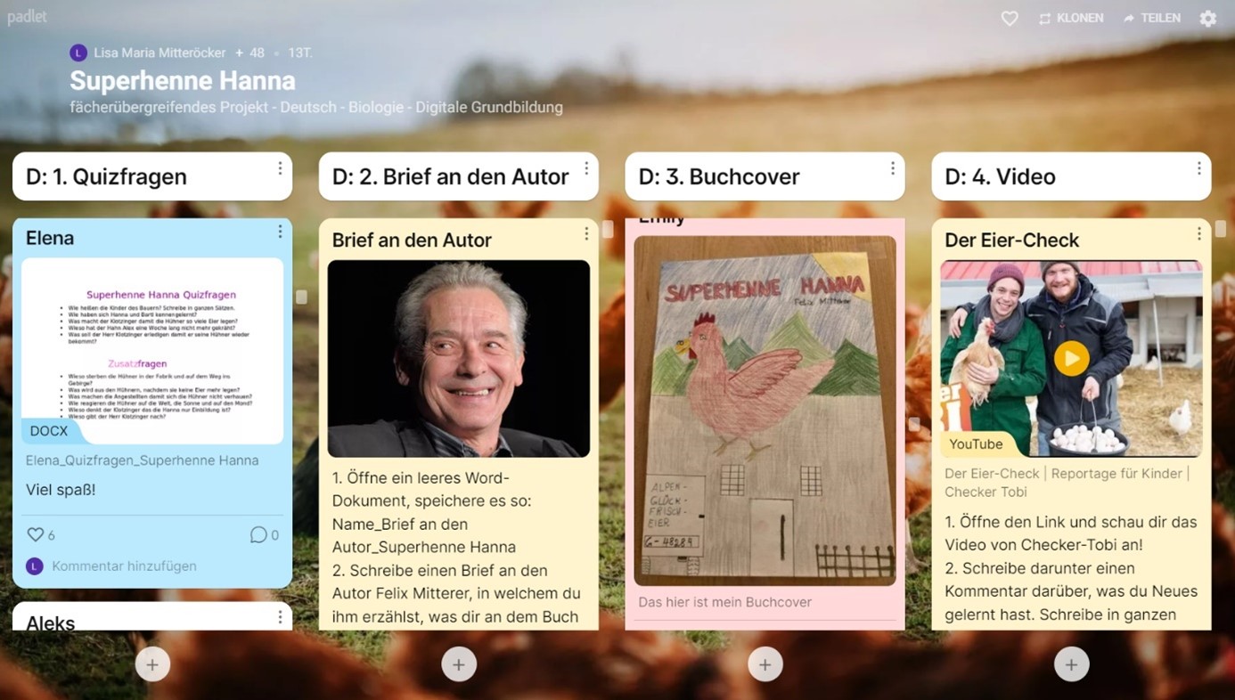 Während wir das Buch lasen, erstellte unsere Klassenvorständin ein „Padlet“, das ist sozusagen eine Art Pinnwand am Computer. Darauf hat Sie Aufgaben gestellt, wie zum Beispiel einen Brief an den Autor zu schreiben. Natürlich schickten wir die Briefe nicht wirklich ab, aber wir lasen sie uns im Unterricht gegenseitig vor! Es machte sehr viel Spaß, die Aufgaben am Computer zu bearbeiten. Wir bekamen auch kreative Aufgaben, wie beispielsweise ein Buchcover zu zeichnen. Wir konnten diese dann auf dem „Padlet“ hochladen und unsere Kunstwerke online gegenseitig kommentieren. Alle Bilder waren einmalig und wunderschön!