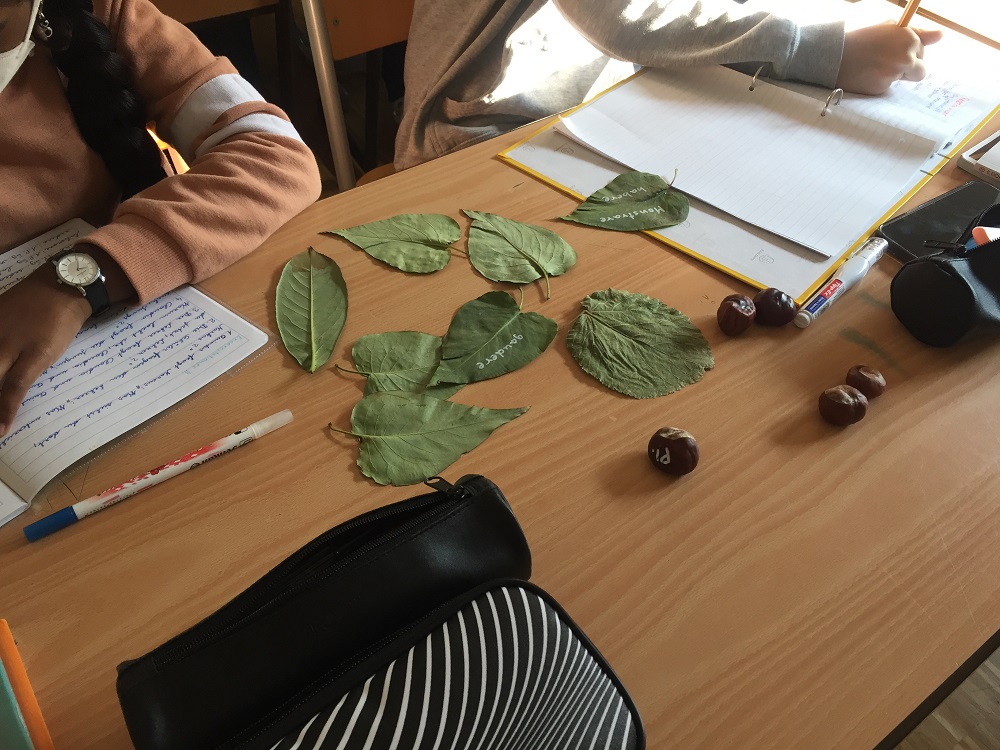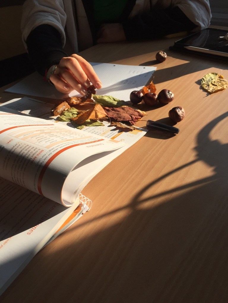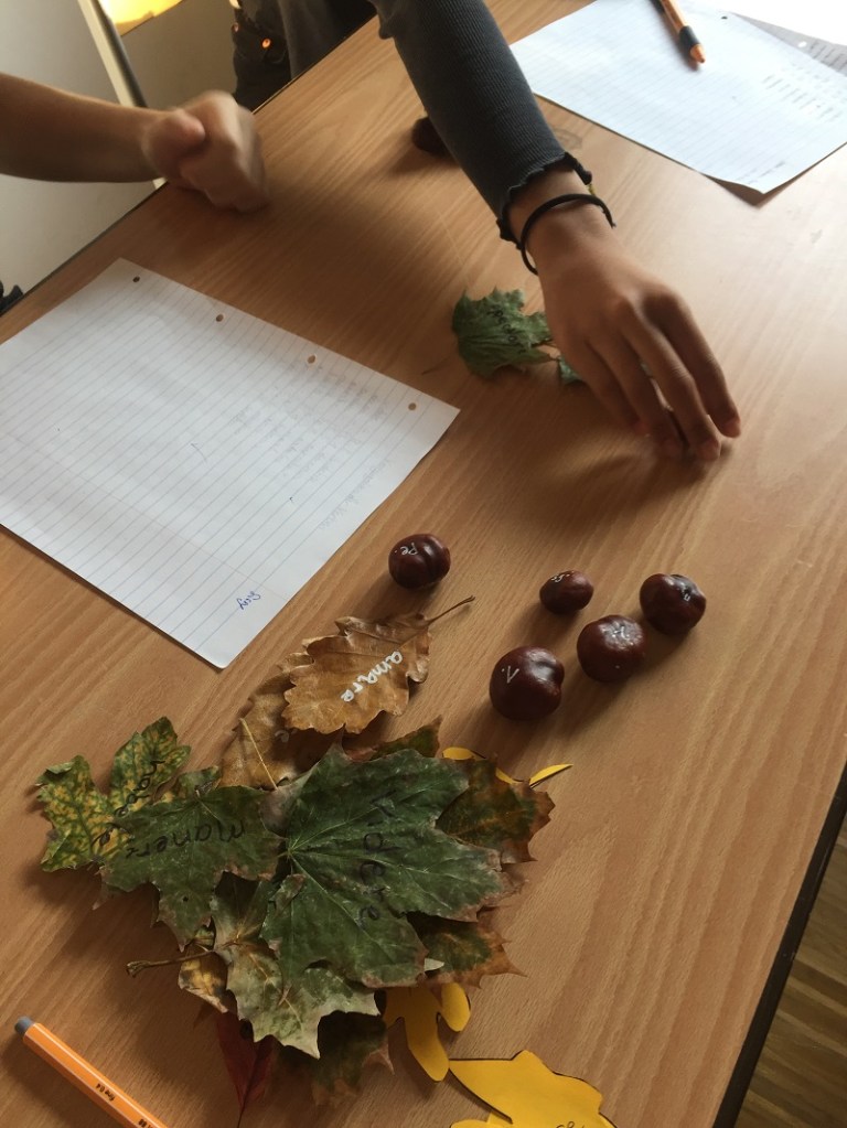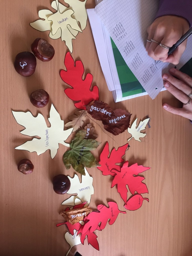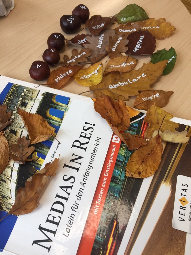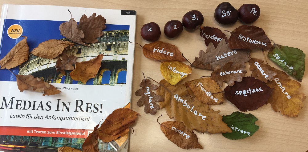 Mit selbst gesammelten Kastanien und Herbstblättern übten die Schülerinnen der 5N1 die a- und e-Konjugation auf eine andere, besonders herbstliche Weise.