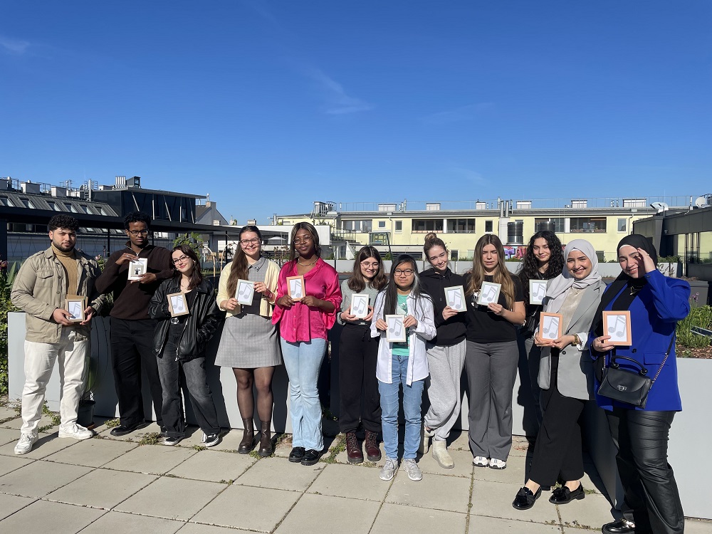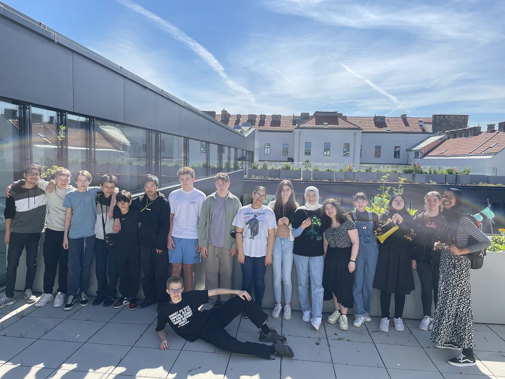Bevor wir uns auf den Weg zu unserem Abschlussausflug ins Museum der Illusionen gemacht haben, gab es noch ein letztes, gemeinsames Klassenfoto auf der Dachterrasse vor unserem Lavendelbeet.