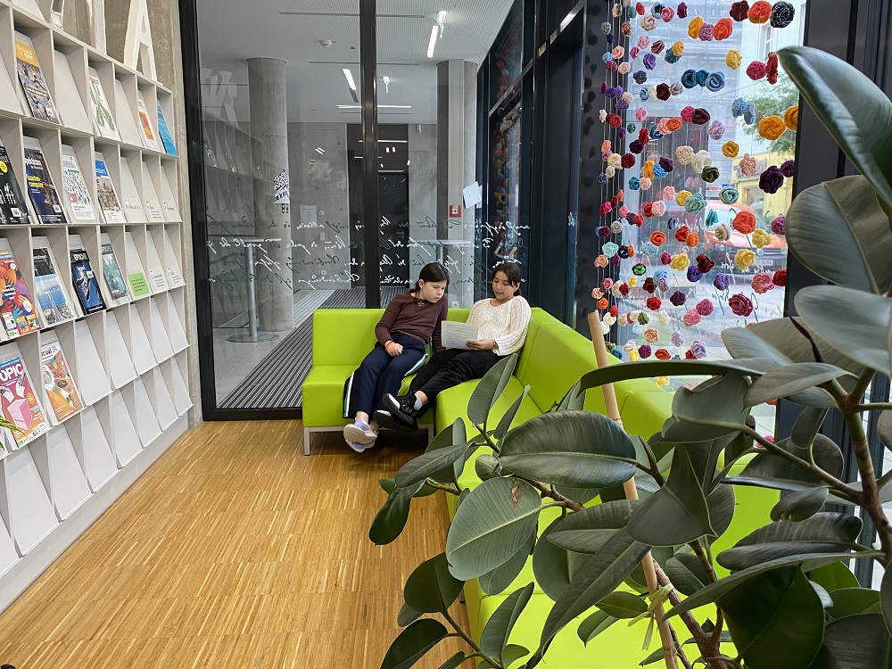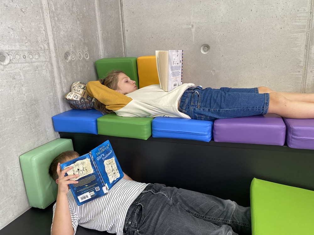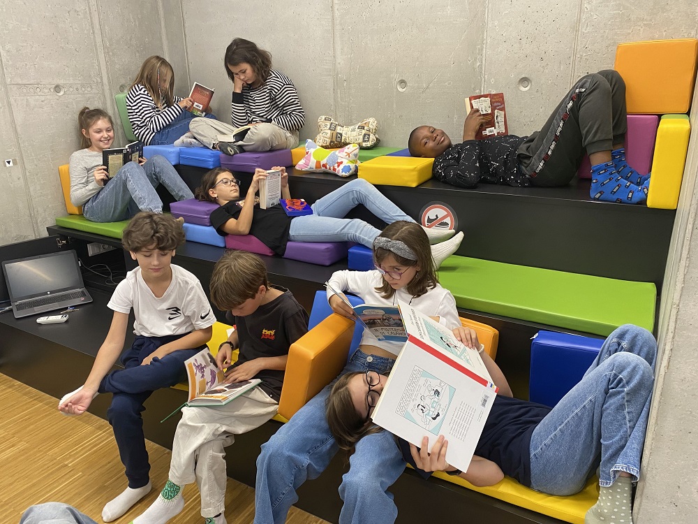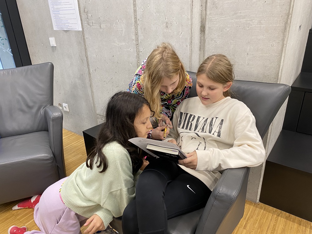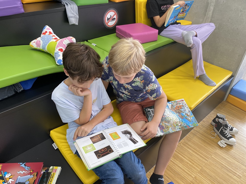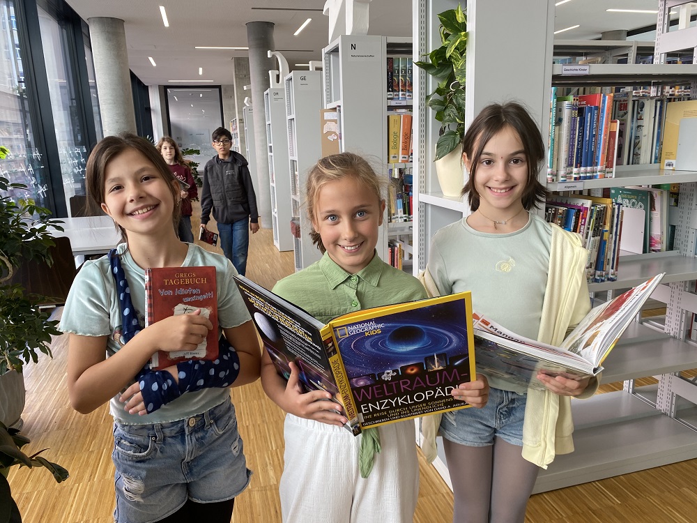 Die Schüler*innen der 1. und 5. Klassen sowie der Ü-Klasse wissen nun, wie sie Bücher finden, ausleihen, verlängern oder reservieren lassen können. Neben den gemütlichen Sofas, den Zeitschriften, den Computerarbeitsplätzen, Sitzstufen und Lerntischen entdeckten sie auch schon etliche Bücher, die mit nachhause durften.