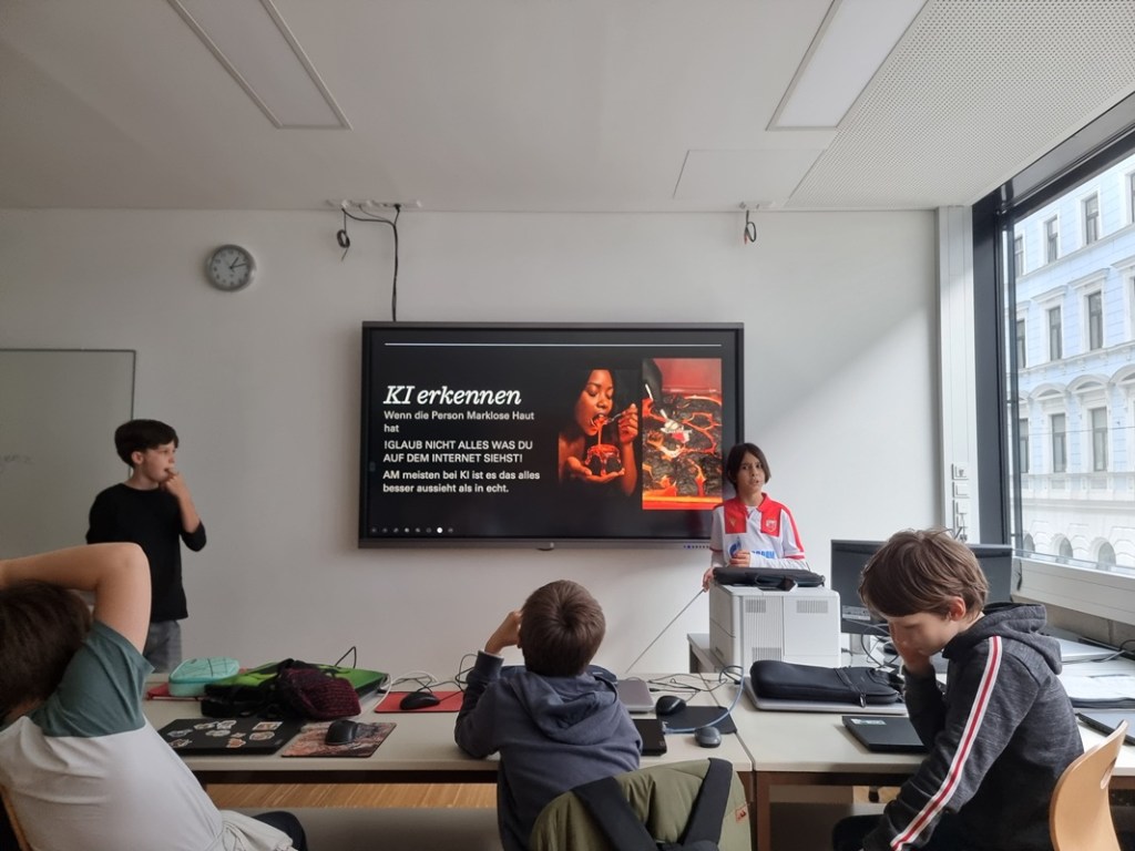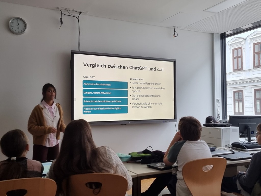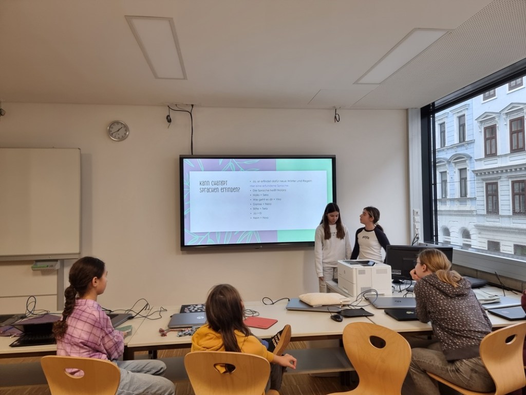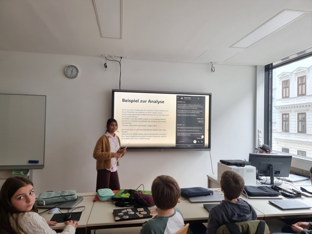 Bereits in der Unterstufe zeigen die Schüler*innen ein großes Interesse an KI-gestützten Anwendungen. Für einen gelungenen Unterricht ist daher eine altersadäquate und verständliche Vermittlung zentral. Nach einer intensiven Auseinandersetzung mit dem Thema setzten sich die Schüler*innen der 2A kritisch mit einem Teilbereich der Künstlichen Intelligenz auseinander und gestalteten dazu in Gruppen eine Präsentation. Die selbstgewählten Themen wurden unter kontinuierlicher Betreuung erarbeitet und sollten möglichst anschaulich und lehrreich aufbereitet werden.