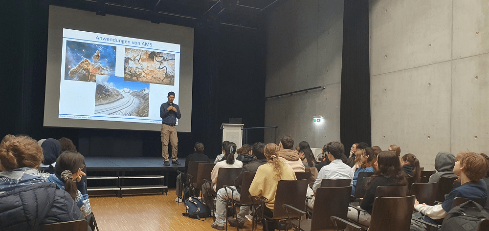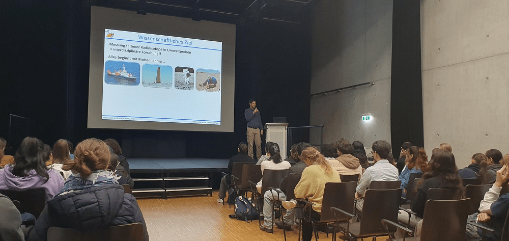Das Projekt „Physics:Science@School“ machte in unserer Schule Halt. Über 100 Schüler*innen nutzten die Gelegenheit, dem Vortrag „Die Welt der Isotope – von Astrophysik bis Umweltforschung“ im Festsaal beizuwohnen. Der Vortragende, Martin Martschini, ist stellvertretender Leiter der Isotopenphysik an der Universität Wien und konnte einen direkten Einblick in sein Forschungsgebiet gewähren.