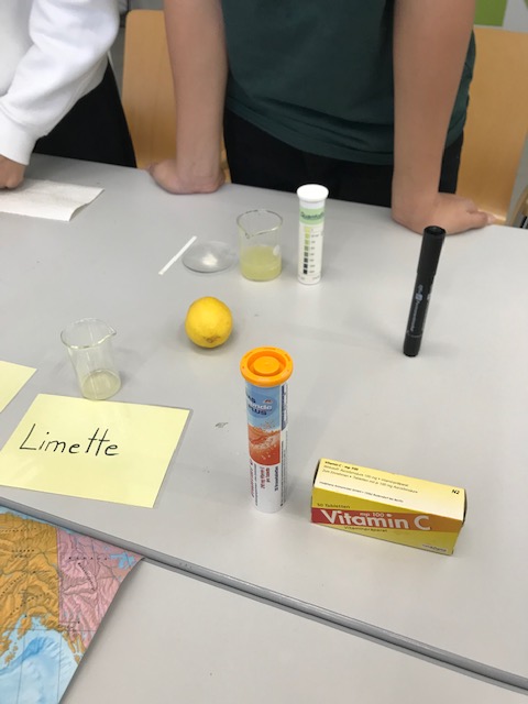 Wo haben Zitruspflanzen ihren Ursprung? Welche verschiedenen Zitrusfrüchte gibt es? Getestet werden die ausgepressten Säfte auf ihren pH-Wert und auf den Vitamin C-Gehalt.