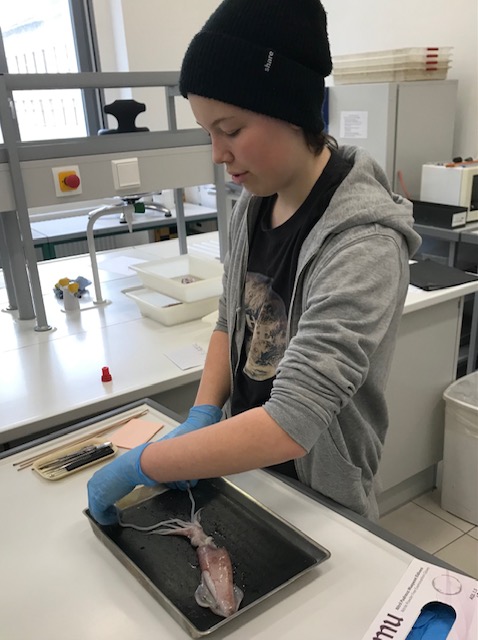 Woraus besteht Tinte? Lässt sich aus einem Tintenfisch die Tinte herausholen? Beim Sezieren eines Kalmars wurde der Tintenbeutel isoliert und die schwarze Tinte gleich zum Schreiben verwendet. Aber auch interessante Infos zu Geheimtinte waren in dieser Station zu entdecken.