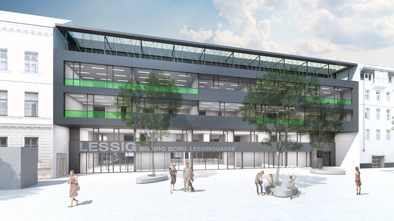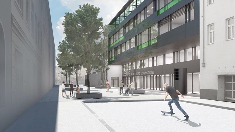 Ihre Pausen können die SchülerInnen in den neu gestalteten Innenhöfen sowie auf Teilen der Dachflächen verbringen. Der barrierefreie Eingangsbereich wird sich auf Seite der Lessinggasse befinden.