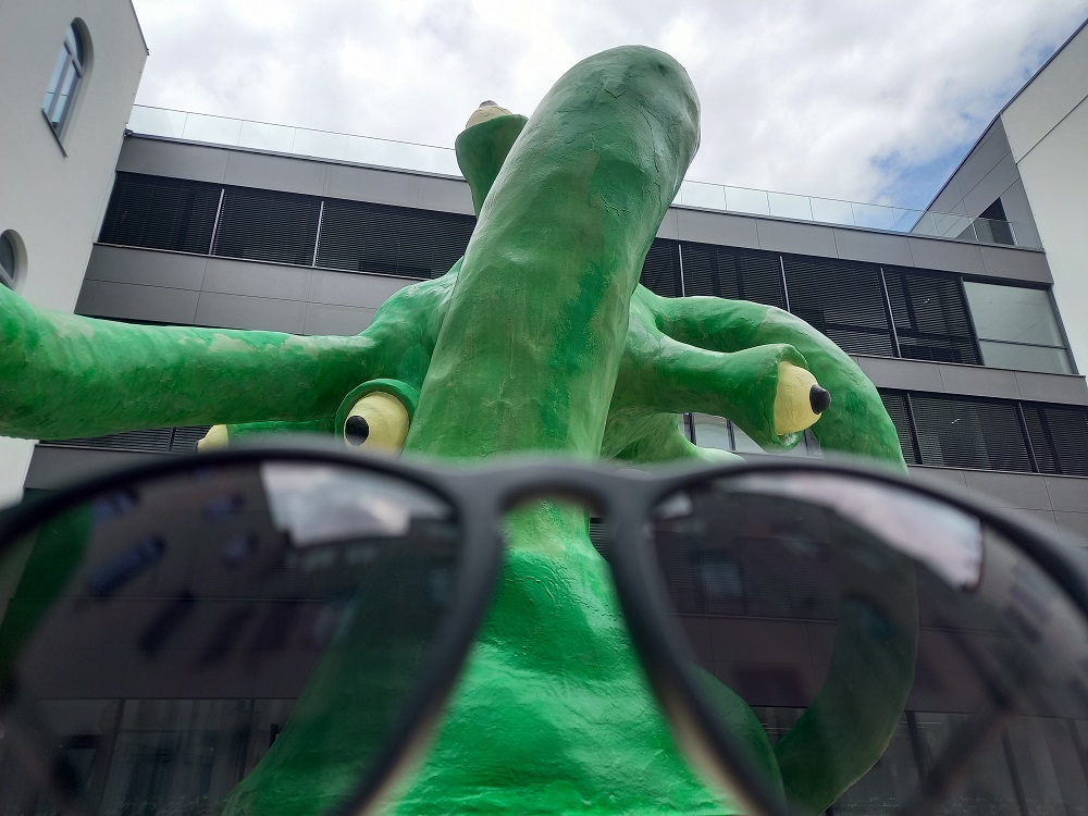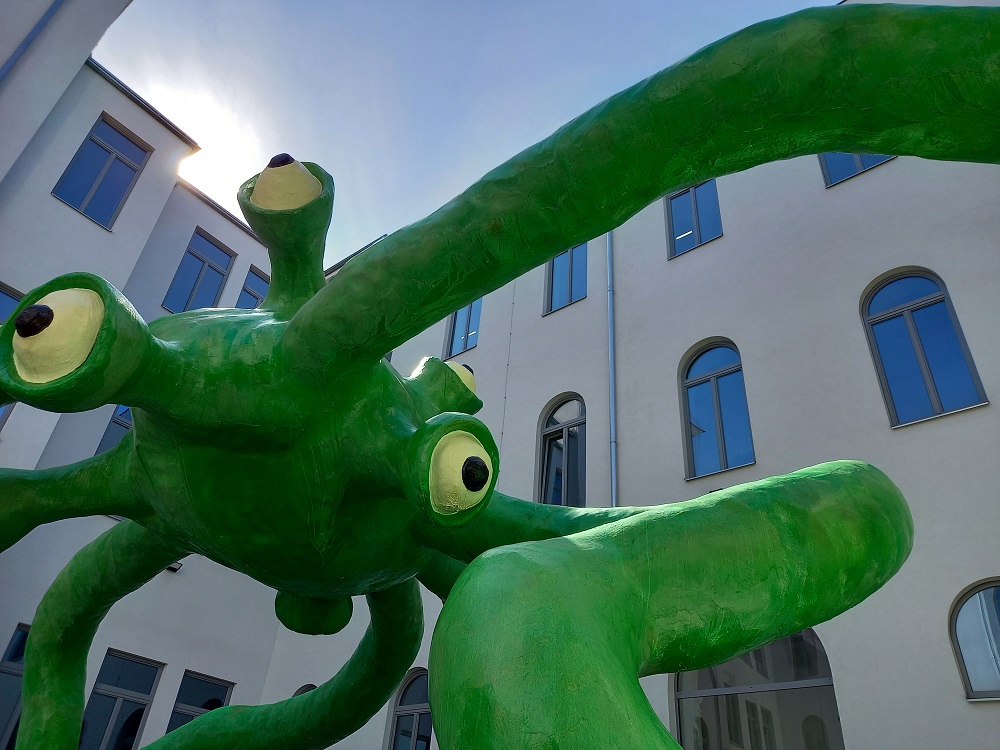Die Skulptur „Myx“ des Künstlerkollektivs Gelatin ist ein kraftvolles, identifikationsstiftendes Wahrzeichen für die Schule, das zu einem humorvollen Umgang mit dem Alltag einlädt. Als solches schafft es einen Ort der lustvollen Kontemplation. Das rund 4 Meter hohe Phantasiewesen, das den Aufbau der Brandentrauchung im Hof besetzt und umspielt, steht für einen geistreichen Humor sowie den Mut, Außergewöhnliches zu denken und zu schaffen. Es erlaubt einen spielerischen Zugang zu Mythologie, Literatur und deduktiven Denken und regt an, über die „Norm-Maße“ hinauszudenken. Der Titel „Myx“ ist vom griechischen „Myxa“ (Schleim) abgeleitet. Das Künstlerkollektiv spielt damit auf die Lehre der Körpersäfte an, in denen die Antike den „Humor“ lokalisierte.